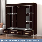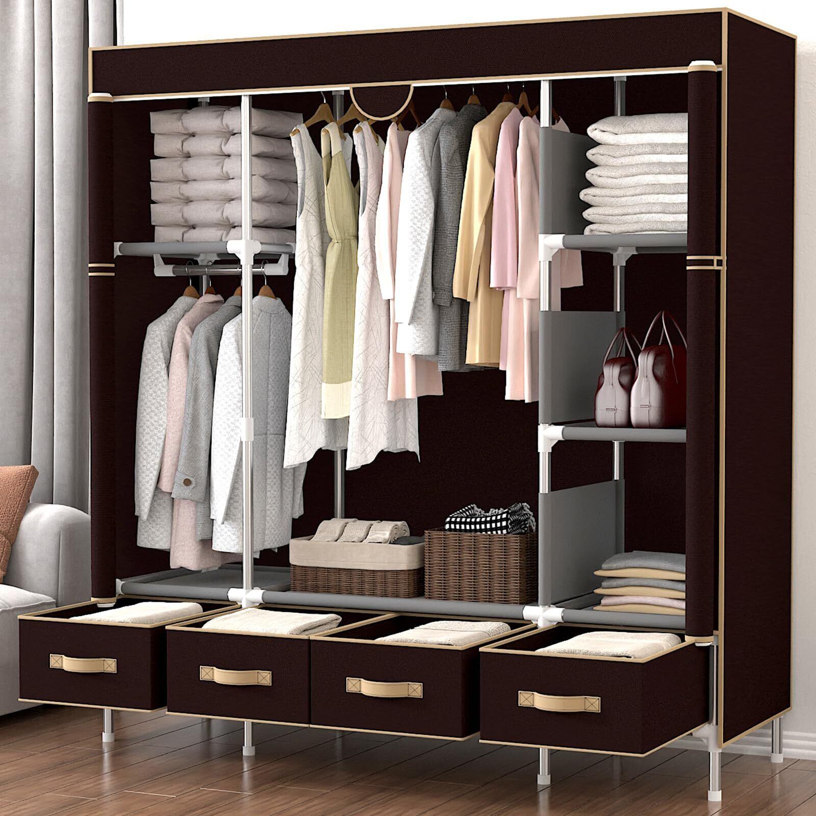 ワードローブ 大容量 収納クローゼット 引き出し4つ付き フードハンガー 簡単組立式 調節可能なスペース 収納棚 防水・防塵・防汚(150×奥行45×高さ170cm) (ダークブラウン)