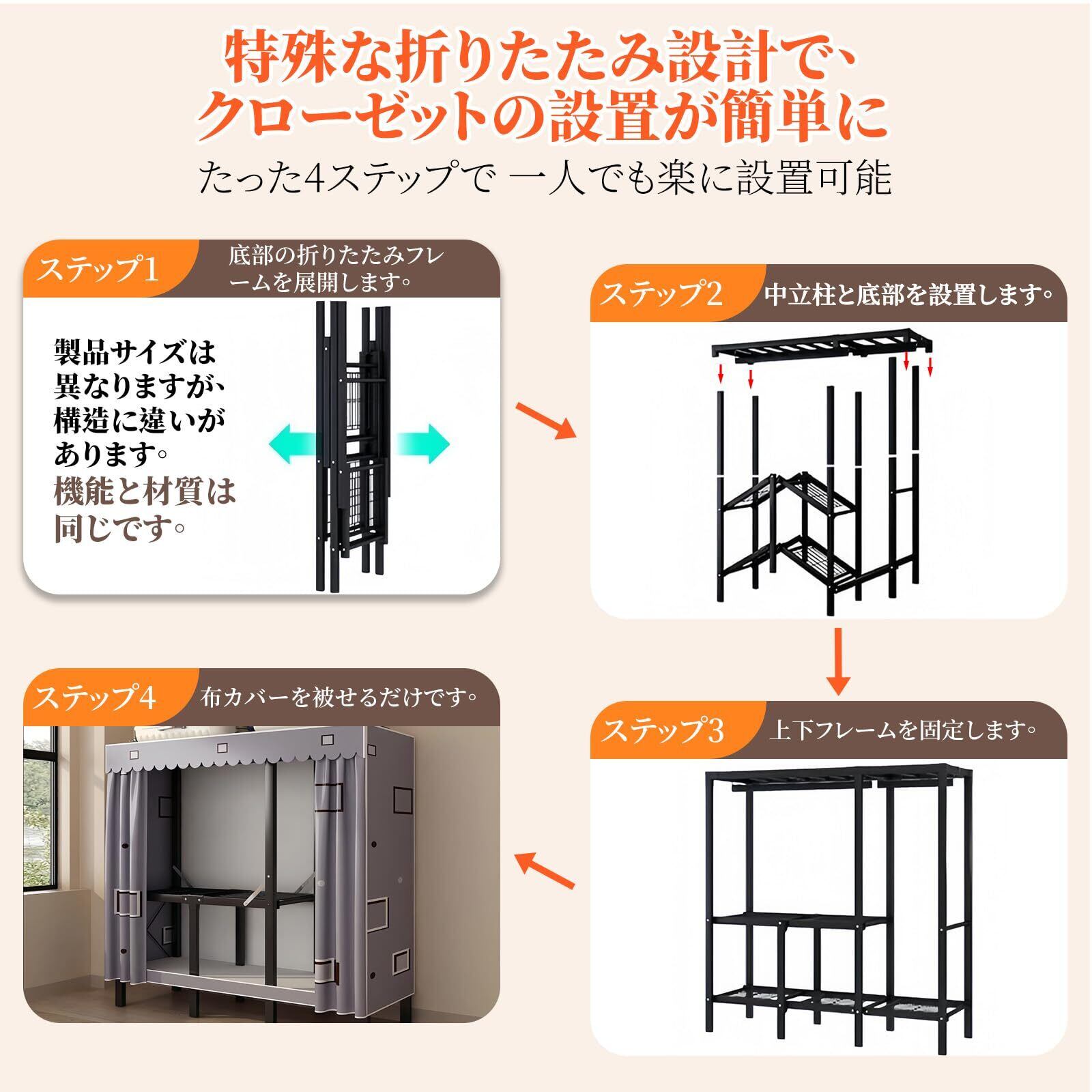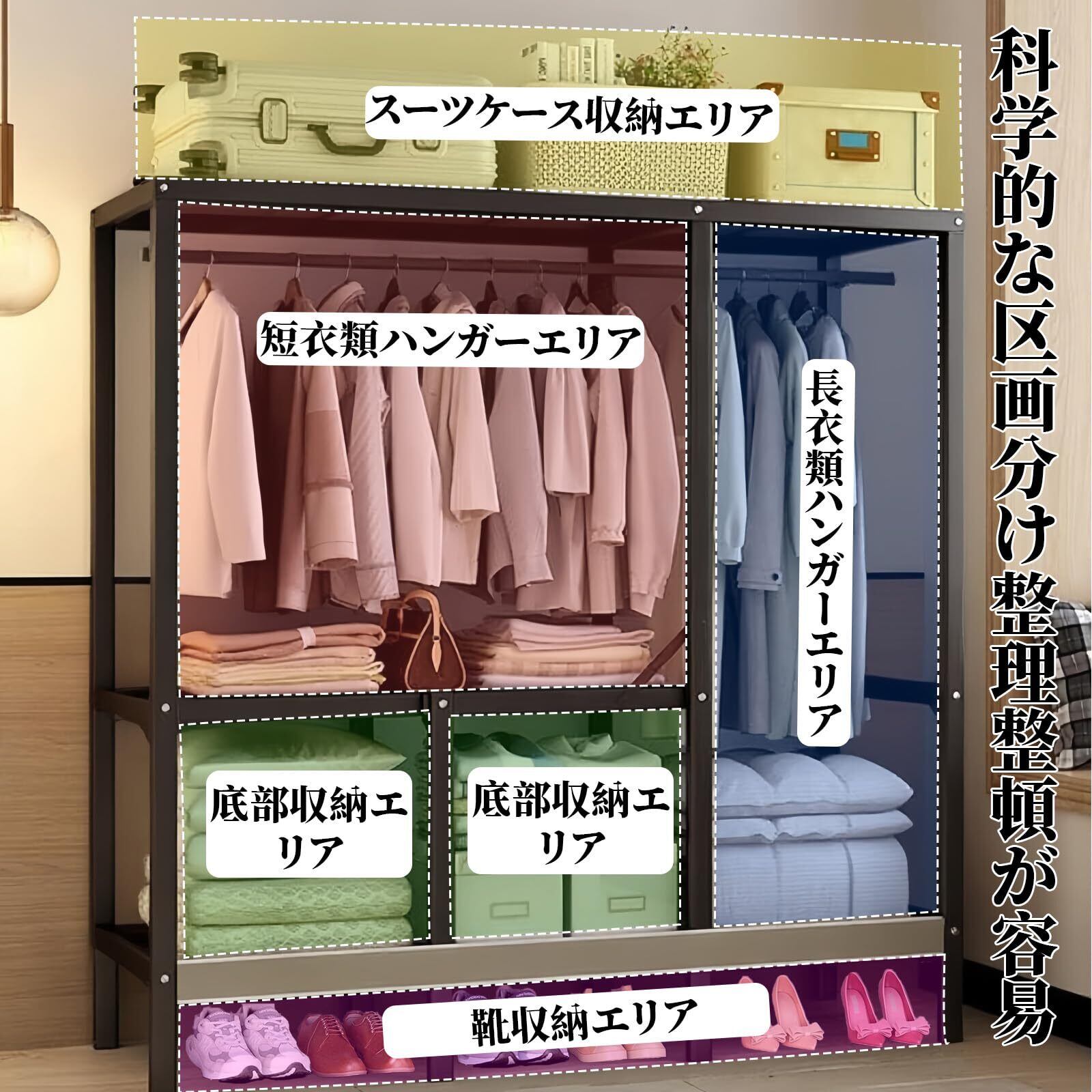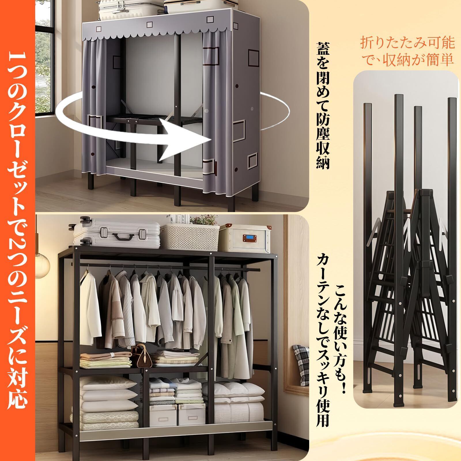 このワードローブは、頑丈なスチールフレームで作られており、高耐荷重の特性を備えています。各層はしっかりとした強度を持ち、長期間の使用にも耐えますので、大切な衣類を安心して保管できます。
