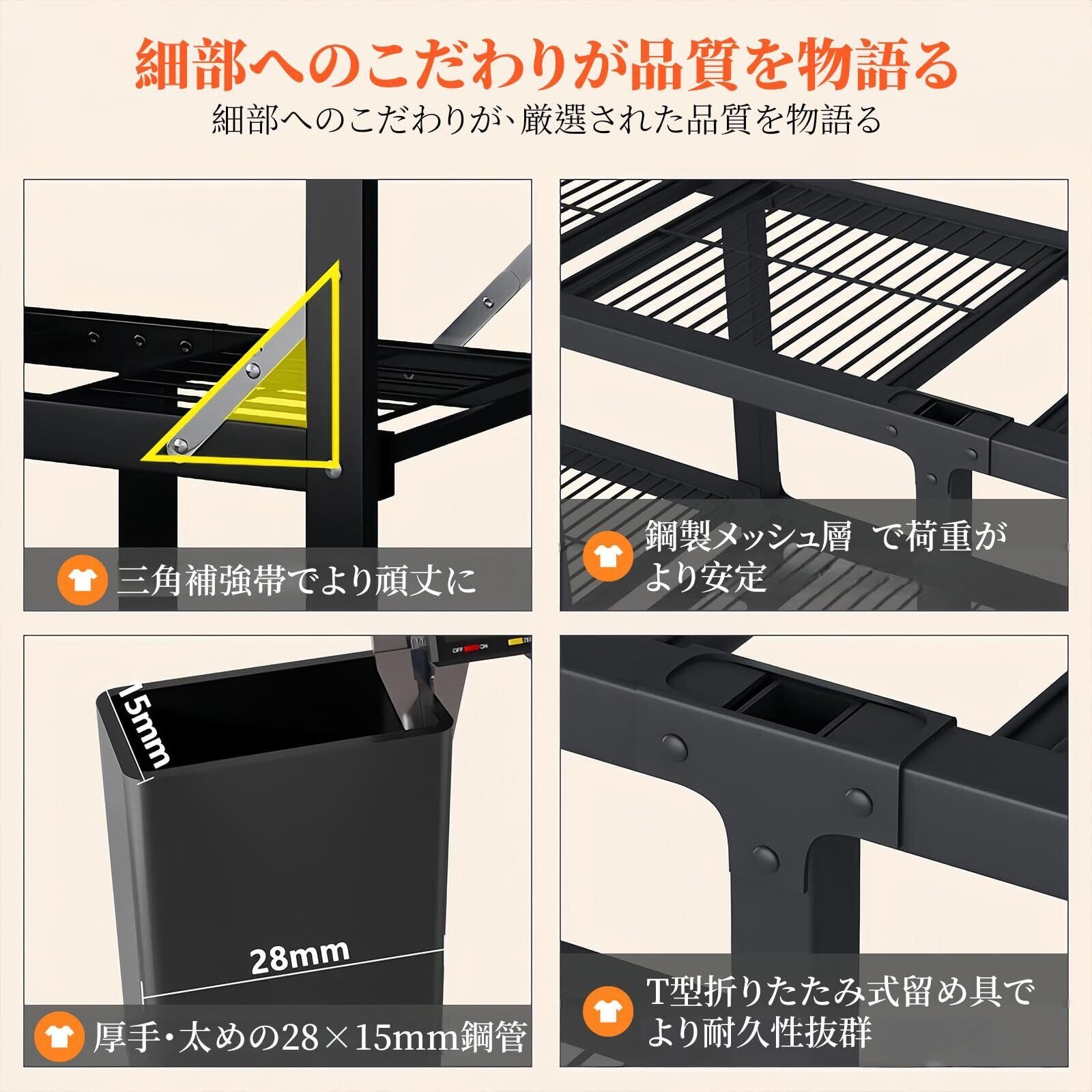 業務用レベルの耐久構造:冷間圧延スチールパイプを骨格に採用。28×15mmの角パイプが重量物にもぐらつかない安定感を提供。構造安定で、硬度高いな利点以外に防水防塵で錆付け難い!