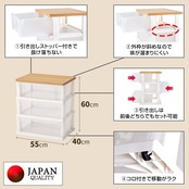 木製天板の上には小物を置くこともでき、使い勝手がアップします。また、キャスター付きなので、下部の掃除も簡単に行え、清潔な生活環境を保つことができます。