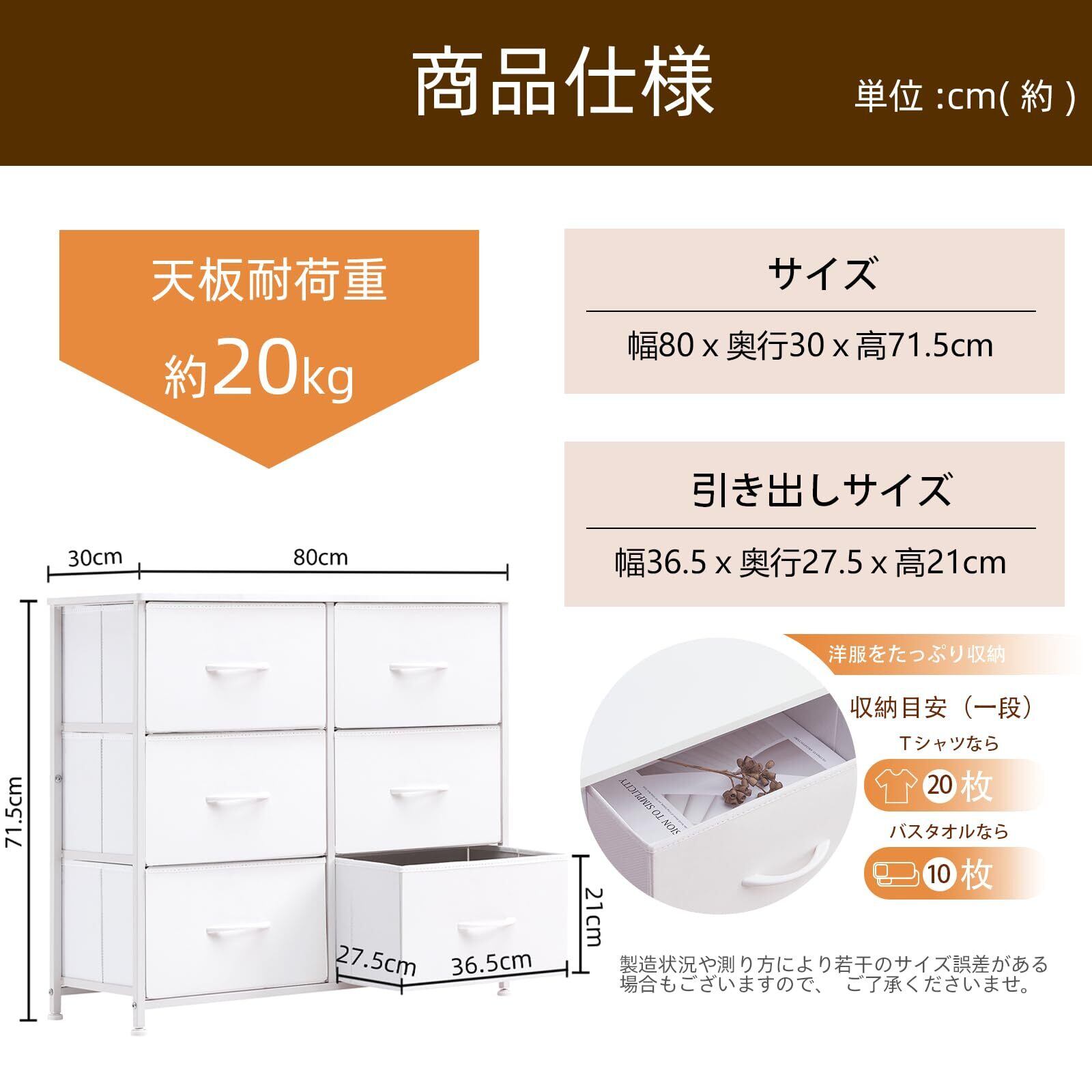 Somdot タンス チェスト 収納 引き出し 棚 布製 洋服ダンス おしゃれ 箪笥 大容量 たんす 幅80 奥行30 高さ72 衣類 ワイド リビング 転倒防止 一人暮らし 3段6杯 白