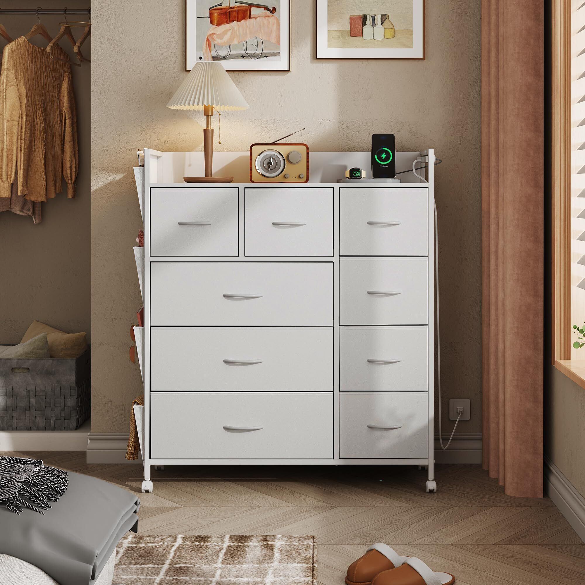 WLIVE チェスト タンス 収納 コンセント付き ファブリックチェスト USBボード キャスター付き サイドポケット付き 洋服収納 4段9杯 箪笥 衣装棚 ハイチェスト リビング収納 おしゃれ 収納チェスト 布製 引き出し 大容量 洋服タンス 衣類収納 北欧 簡単組立 シンプル ホワイト 白 ASNG609