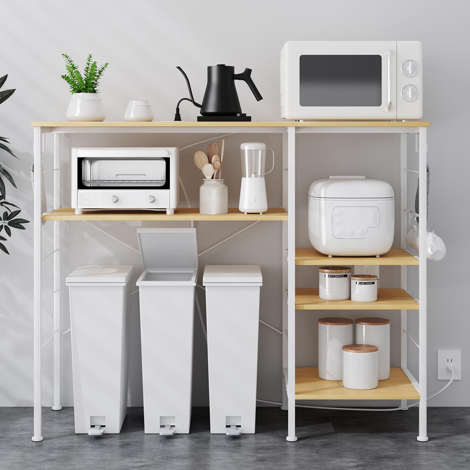 1、5段の棚と可動式設計により、電子レンジや食器、調理器具などを自由に置けるスペースを確保。上段には調味料や小物を便利に収納でき、下段には大型の家電も安心して収納できます。キッチンの整理整頓も容易になり、ストレスのない料理環境を実現します。