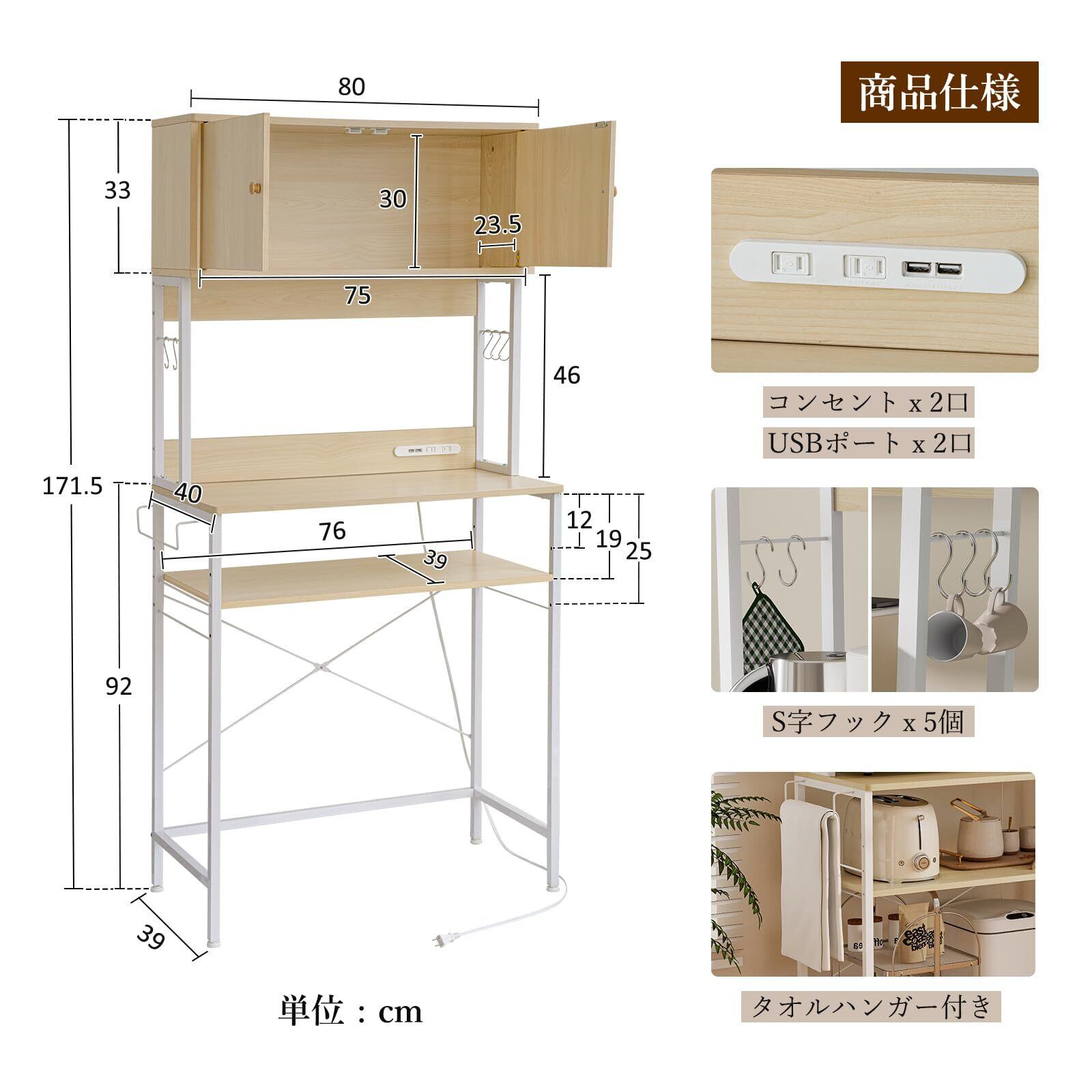 LYNCOHOME 幅80 ワイドレンジラック 計4口 コンセント付き USBポート付き キッチン上部収納棚 レンジ台 レンジボード 食器棚 キッチンラック キッチン収納 大型レンジ対応(ナチュラル オーク アイボリー)
