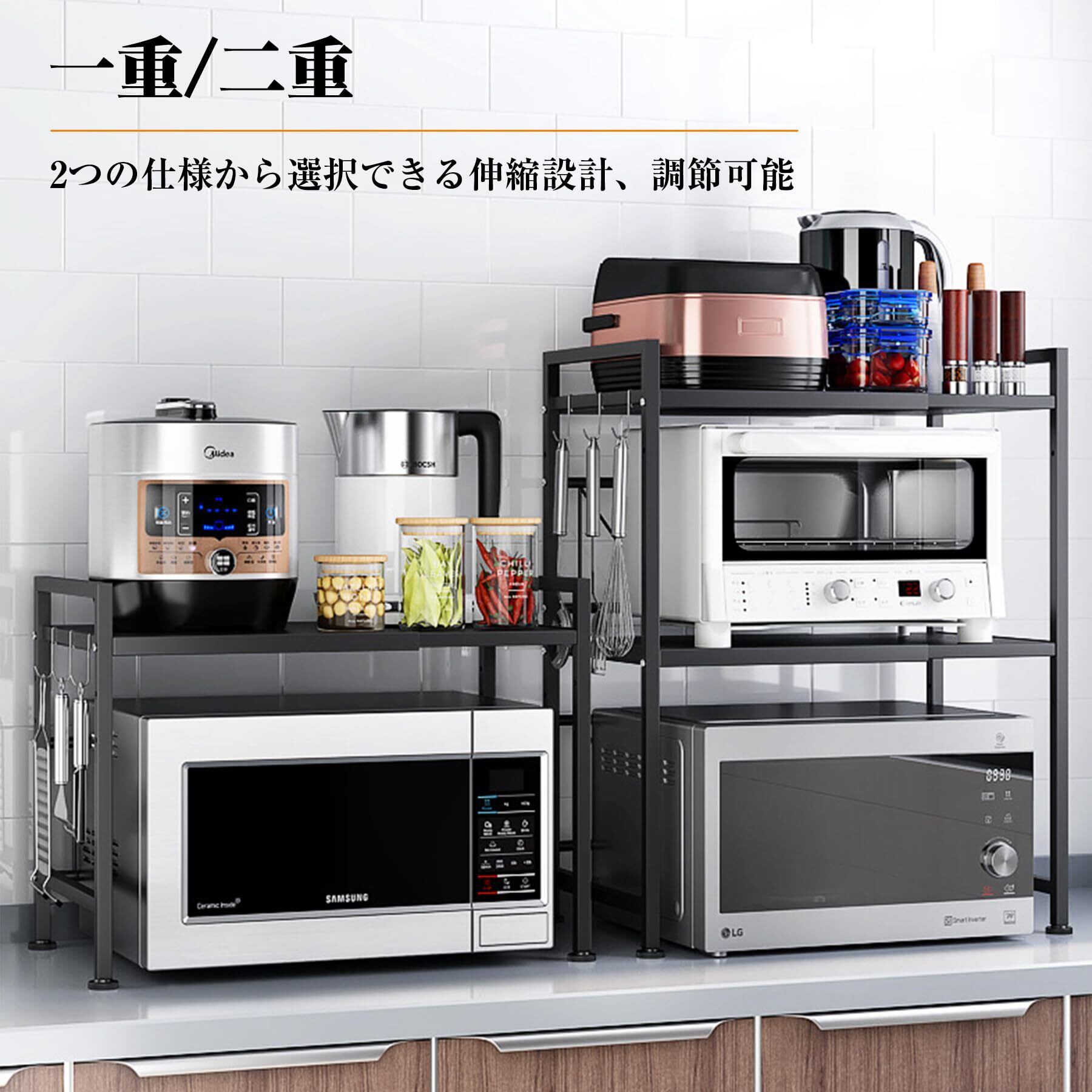 【ストレッチ可能なキッチン棚】電子レンジの上の死角を有効に活用する:電子レンジの上の棚の幅は約38センチから64センチ(内寸)の間で無段階に調節でき、可動棚の高さは3つの位置で調節できる。 電子レンジの大きさ、貯蔵品の数、物を置く場所の大きさに応じて、台所に最適な方法で設置できます。 トースターなどの台所用品やフライパン、瓢箪鉢、物置かごなどの大きなものを保管することができる。 シンプルなデザインとは、カウンターの高いところに置いても圧迫感がなく、清潔で美しく見えることを意味します。