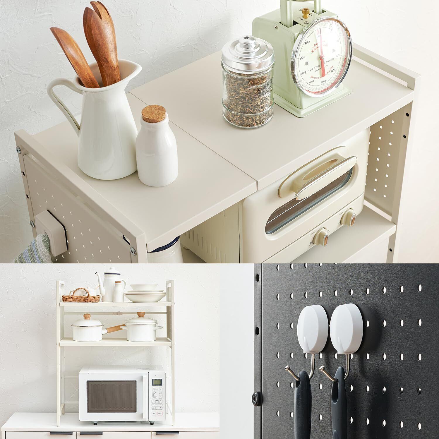 1、6段階の可動棚があるため、お好みに合わせた高さに調整でき、大型の電子レンジやトースターも楽々収納可能です。さらに、有孔ボードを利用して、調理器具やキッチンツールを吊るしておくことができ、作業スペースも清潔に保てます。