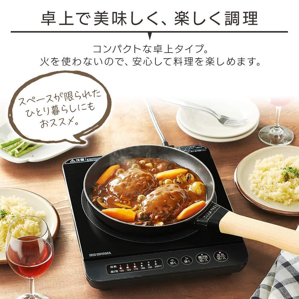 「アイリスオーヤマ IHコンロ 1口」は、スタイリッシュなブラックデザインが特徴で、キッチンをおしゃれに演出します。1400Wの高火力により、煮る・焼く・蒸すといった多彩な調理がスピーディに行えるので、忙しい日の食事準備も迅速に対応可能です。