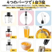 【1台7役、コスパ最高】この多機能ハンドブレンダーは、6種類の異なる使い方ができ、日々の料理を便利にサポートします。「つぶす」「混ぜる」「刻む」「粉砕する」「かき混ぜる」「泡立てる」「卵を泡立てる」と、幅広い調理シーンに対応。人間工学に基づいた設計で、若い女性でも簡単に操作可能です。食品のブレンド、スープ作り、調味料やベビーフードなど、あらゆる料理に活躍します。さらに、4つの異なるアタッチメントが付属しており、これらを本体と組み合わせることで、手軽に7つの機能を使い分けることができます。