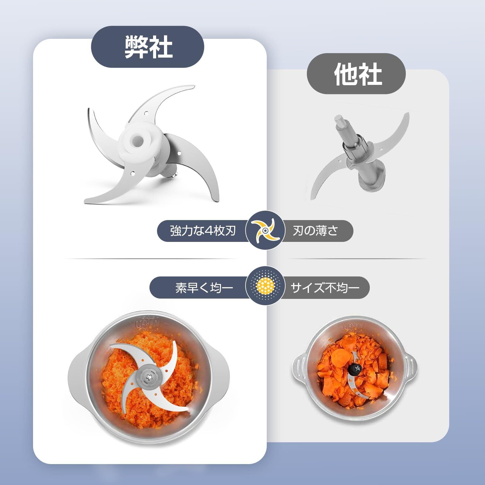 【ハイパワーで10秒完了&強力な4枚刃&操作簡単】350Wハイパワーで10秒でみじん切りができ、調理の時間がより心地よく楽しいものになります。強力な4枚刃が高速回転し、よりすばやく均一に刻むことができます。操作も簡単、粗く切った食材を入れてスイッチを入れるだけなので、直感的に使えて便利です。刃が鋭いので、ぜひ気をつけてください。