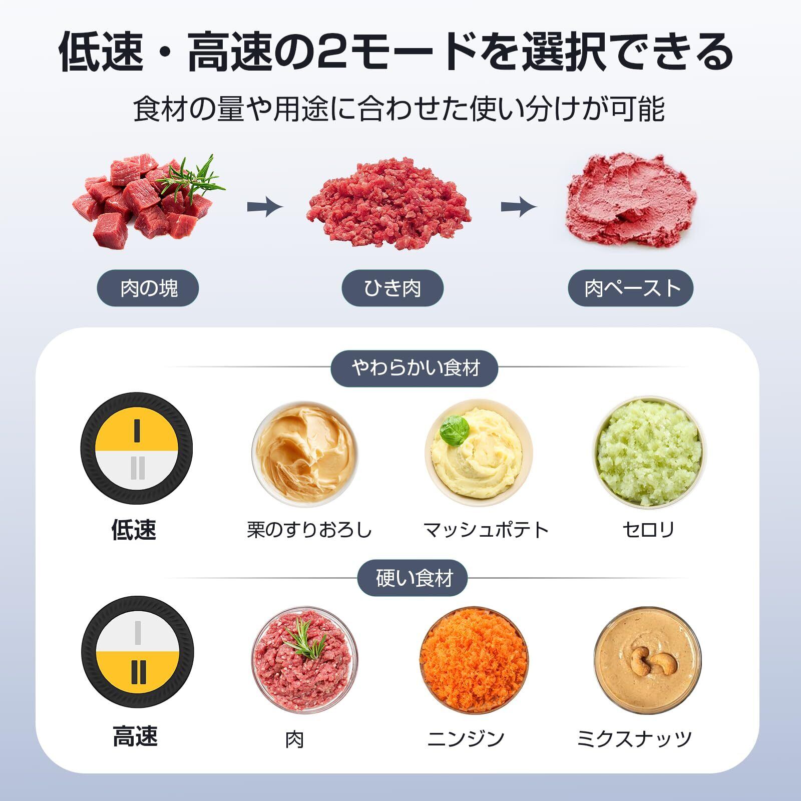 【2段階の速度調節機能】2段階の速度調節機能を採用し、厚さの異なる食材の需要に応えます。食材を粗めにカットできるのはもちろん、なめらかなペースト状にすることも可能。ドライカレーやミックスジュース、離乳食まで幅広く活用できます。