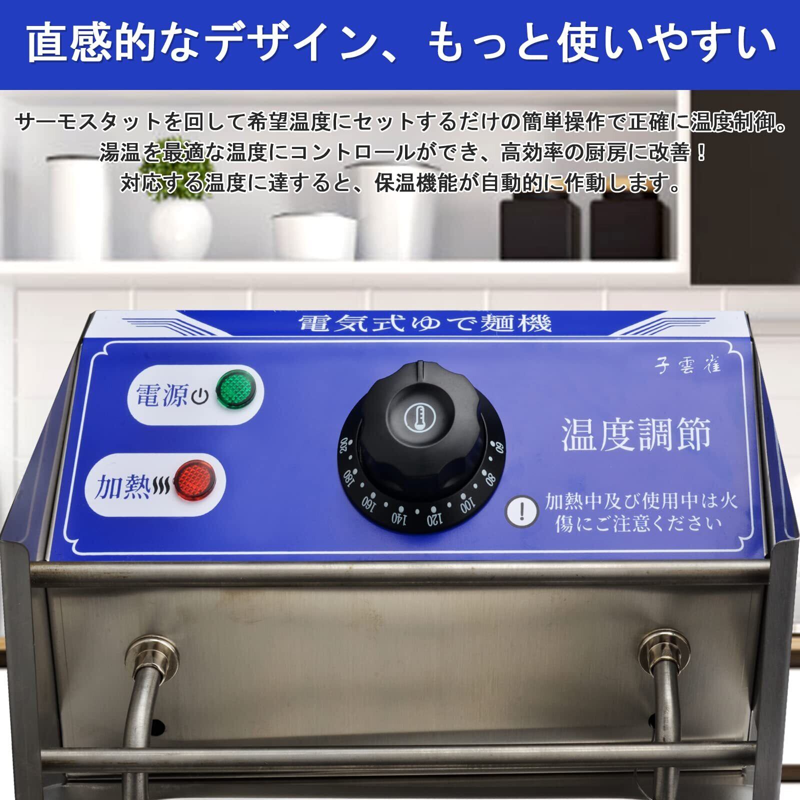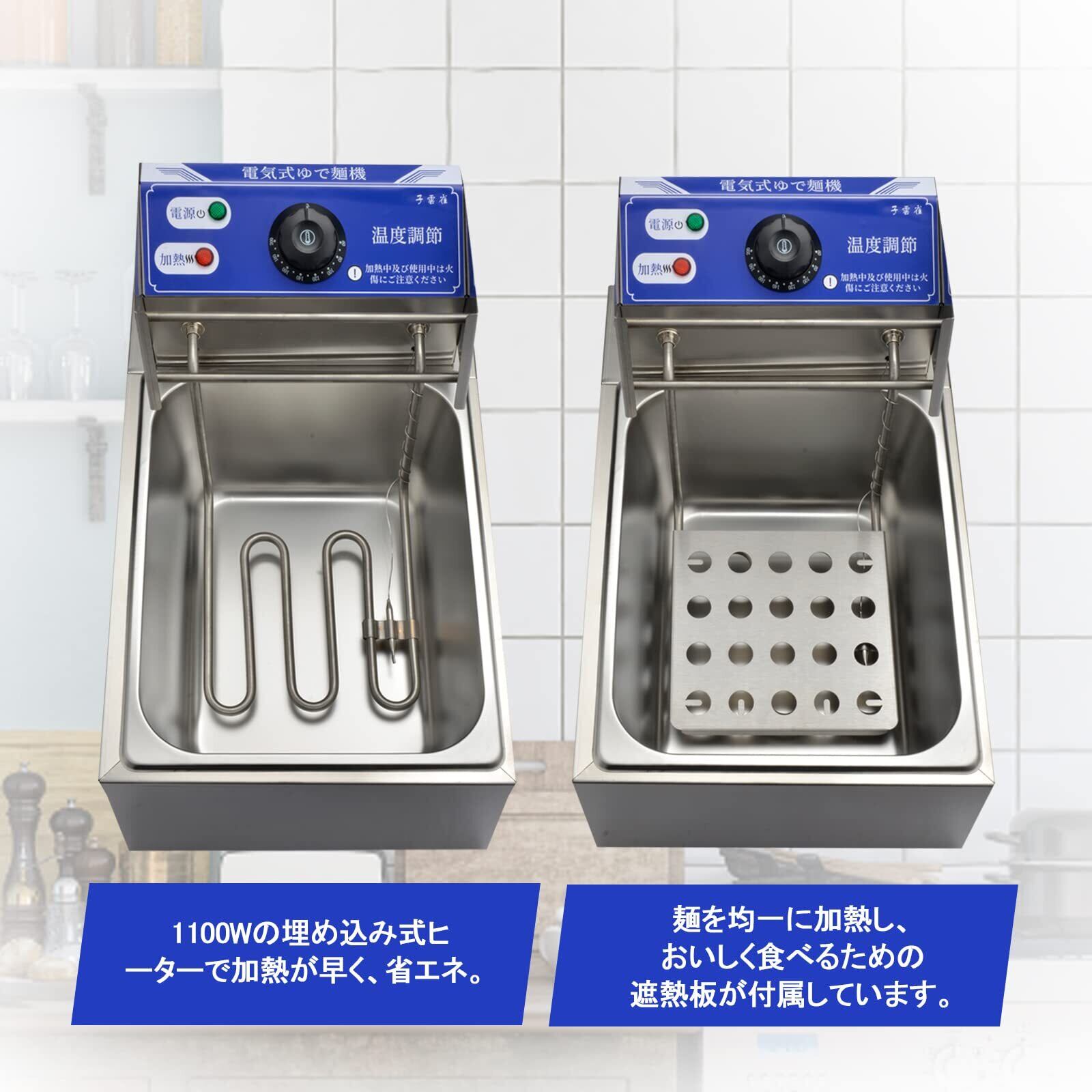子雲雀 電気式麺茹で器 ステンレス鋼製 空焚き防止装置内蔵 保温機能あり 0℃-200℃調整可能 1100W 日本語表記 省エネ 卓上タイプ 日本語説明書付き テボ2個付き 業務用 家庭用 うどん そば ラーメン