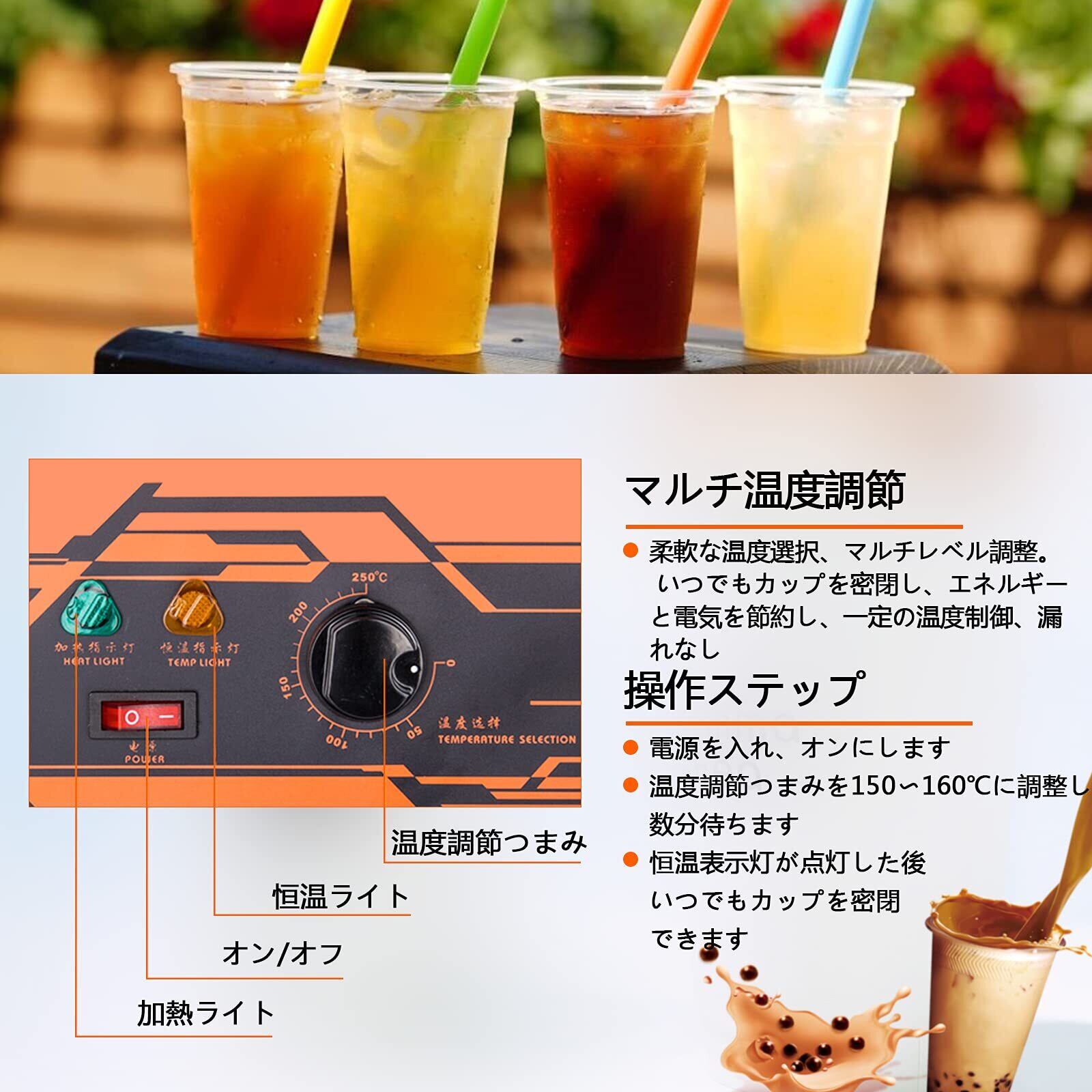 MXBAOHENGのカップシール機は、90mm、95mm、70mm、75mmのカップに対応し、高さは18cm以内に適用可能です。手動操作ながらも、400〜600カップ/時の生産性を誇ります。お茶、コーヒー、ジュース、タピオカミルクティー、豆乳など、あなたのビジネスの幅を広げる理想のアイテムです。