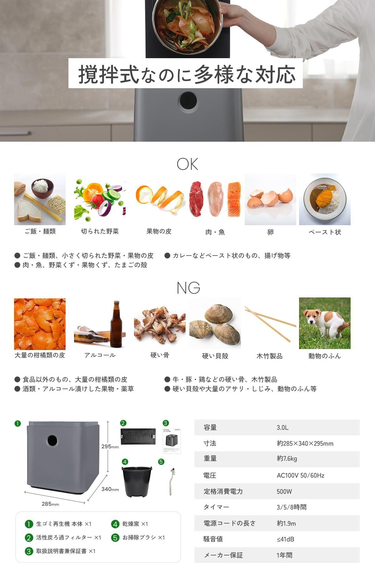 SunRuck 生ごみ処理機 GREEN CIRCULAR BOX 最大92.8%減量 生ごみ再生機 乾燥式 粉砕式 電動 家庭用 堆肥 天然肥料 SR-CL500-GY