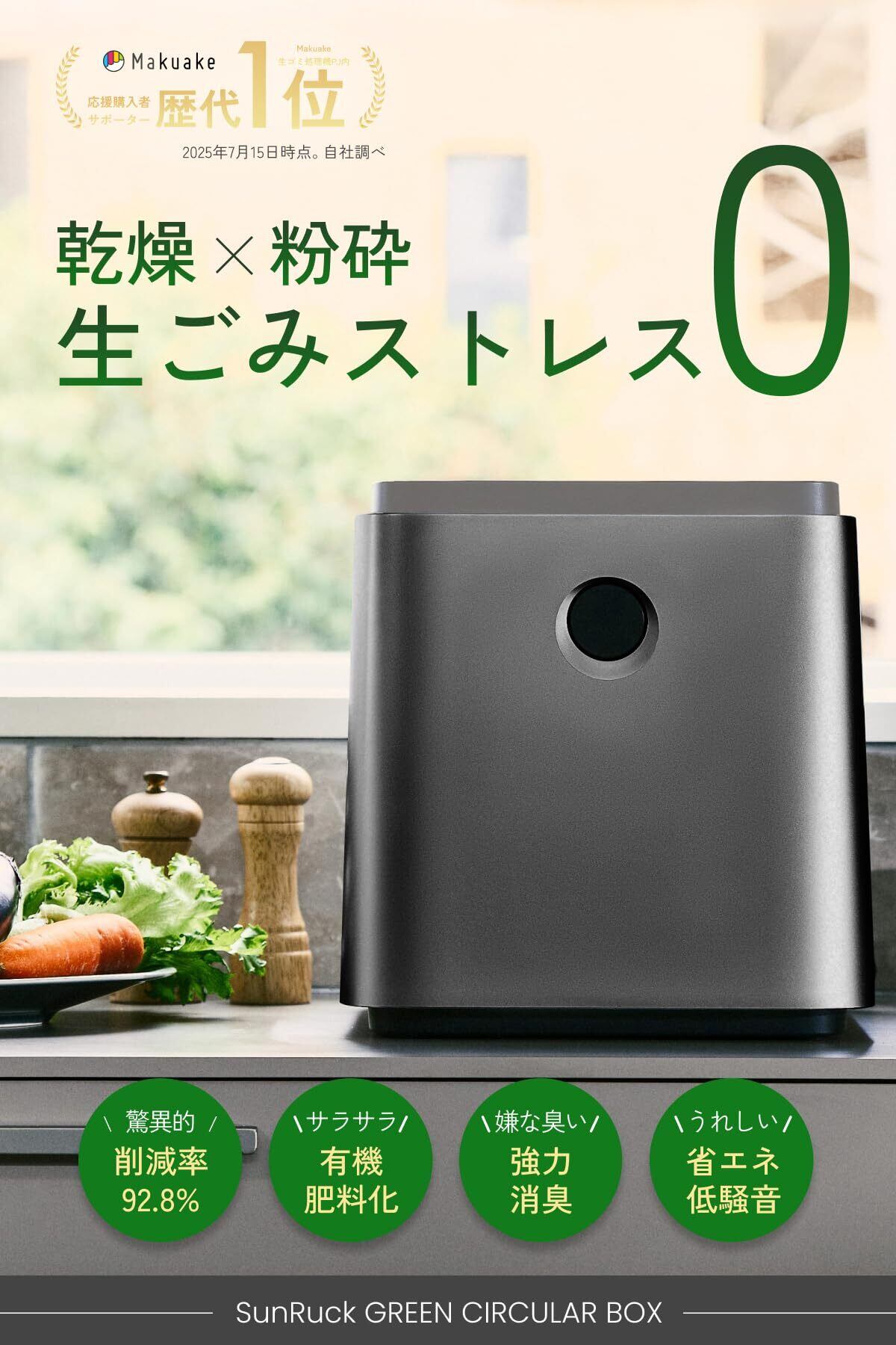 SunRuckのGREEN CIRCULAR BOXは、家庭で発生する生ごみを最大92.8%も減量できる優れた処理機です。乾燥式、粉砕式のコンパクトな設計で、キッチンに置いても場所を取らずに利用でき、エコライフを応援します。