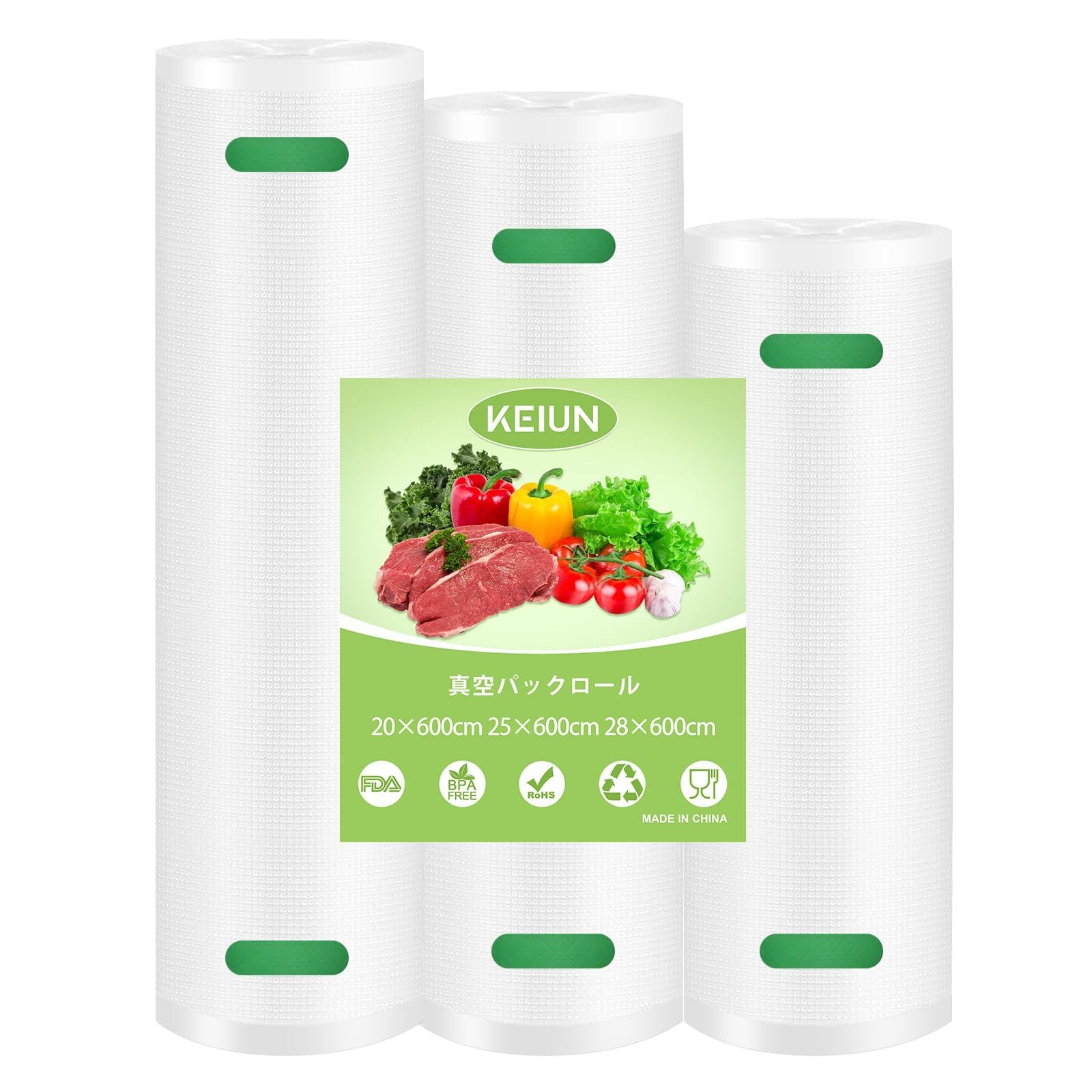 KEIUNの真空パック袋は、自宅で手軽に食品を真空保存できる便利なアイテムです。20cm、25cm、28cmの幅がそれぞれ600cmのロールが3本セットになっており、必要な長さに自由にカットして使用できます。安全なPA+PE素材を採用しており、食品の品質をしっかりと保ちます。