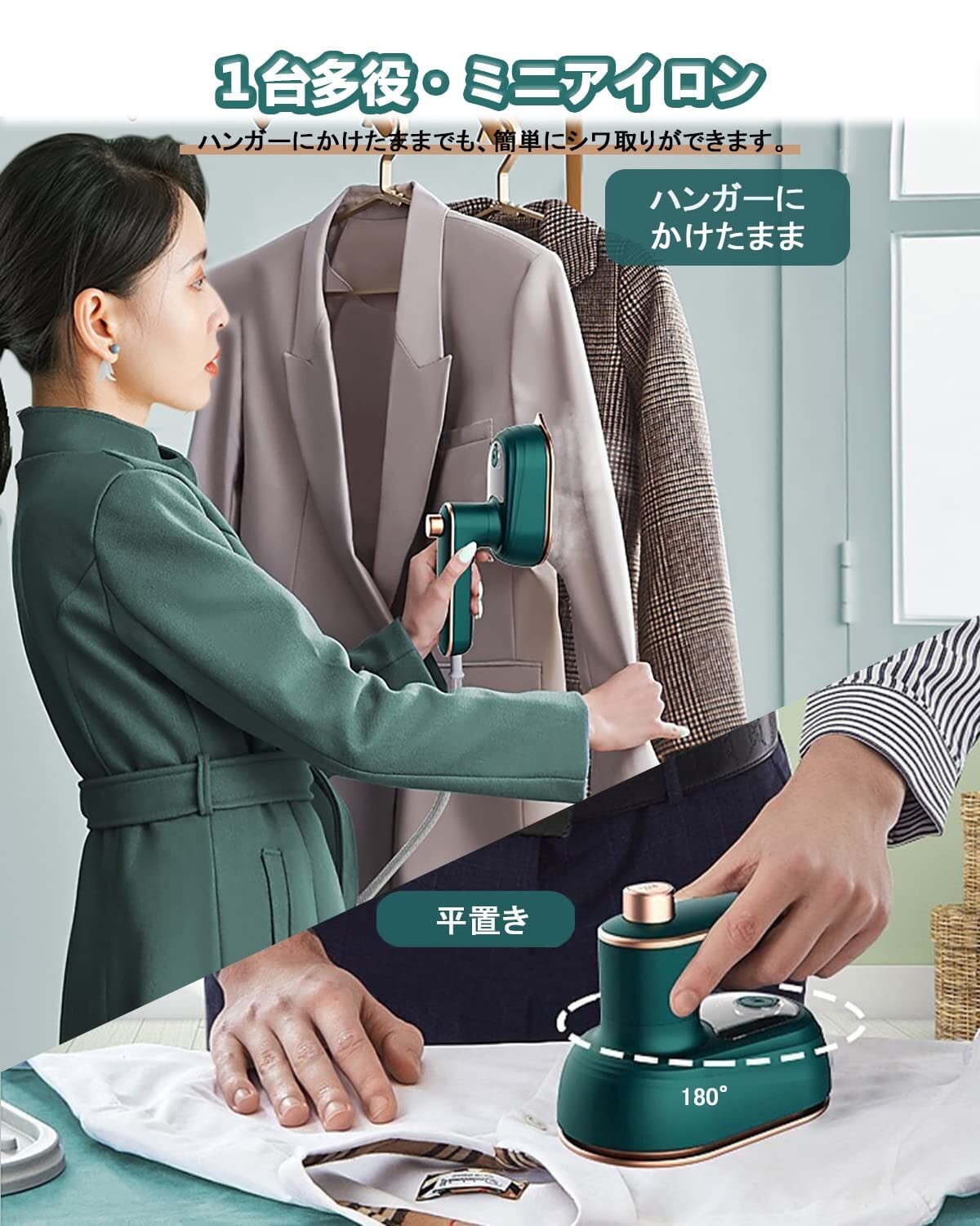 【1台多役・ミニアイロン】 このミニアイロンは、2タイプ機能があります。アイロン台不要、ハンガーにかけたままもシワ伸ばすことができます。凄く簡単にシワが取れました。ドライアイロンとして、アイロン台でシワを取ることだけではなく、折り目を作ることが可能です。襟付きの服に特に適しています。