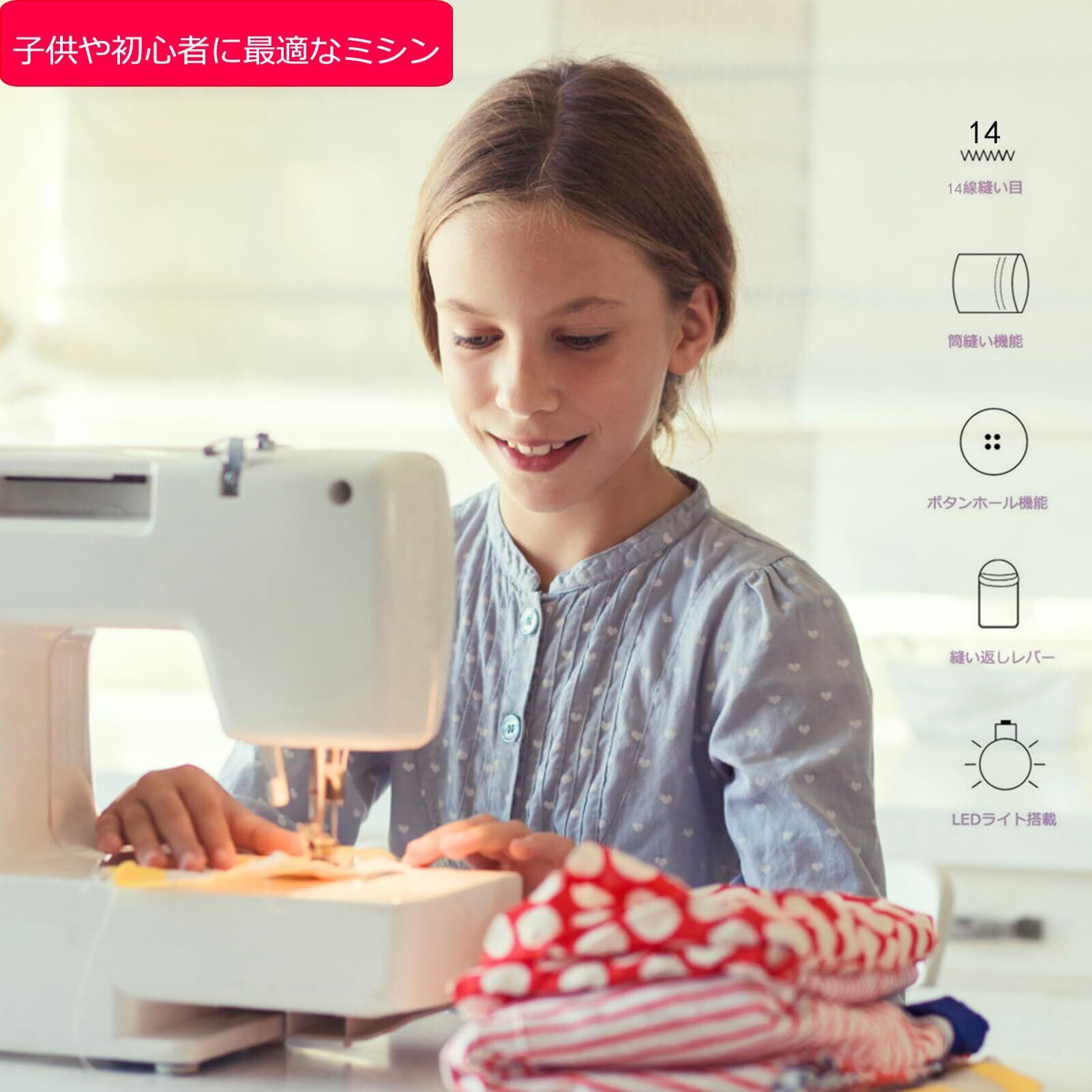 \特価商品!電動ミシン コンパクト家庭用ミシンセット 初心者 14種の縫い目 小型 ミニ ポータブル 低騒音 返し縫い フットコントローラー スピード可調整 拡張ボード 収納袋 DIYコットン柄の織物7枚 12色ミシン糸 日本語取扱説明書付き/