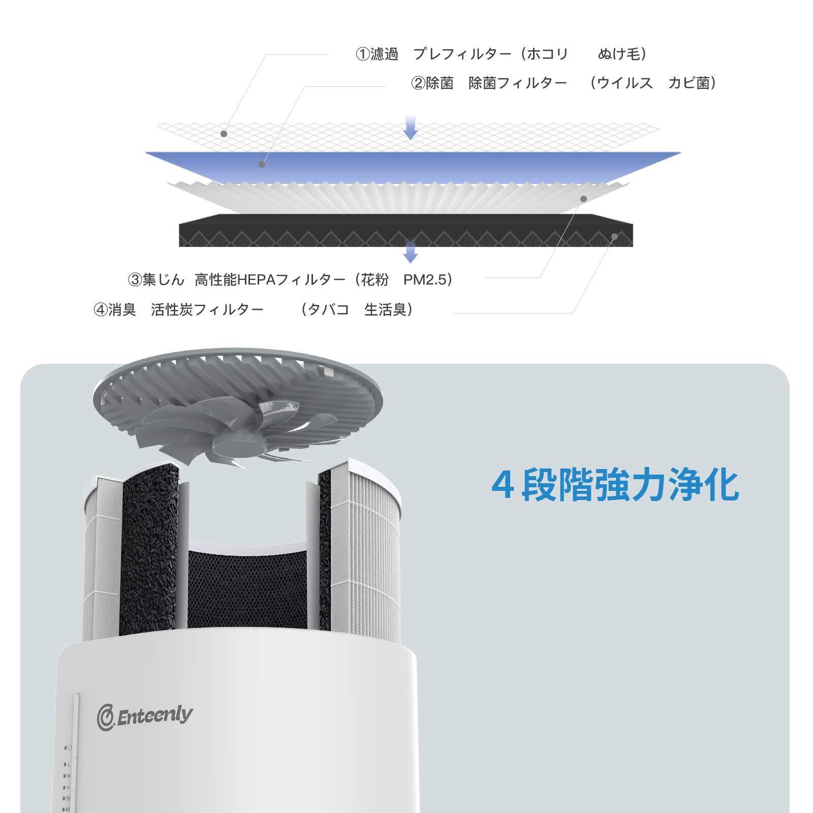 【圧倒的なHEPAフィルター、しっかりと除菌・集じん・消臭】 Enteenly空気清浄機能では、4段階システム浄化機能のある高性能フィルターを採用、春の花粉対策はもちろん、アレルギー症状・ウイルス対策にも役立ち、あらゆる空気の汚れをしっかり除去して部屋を清潔に保ってくれます。純正のHEPAフィルターを採用、花粉、カビの胞子、ほこり、ペットの鱗屑、微生物、煙など、空中のアレルゲンの99.97%*を捕捉します。高品質な粒状活性炭により、タバコ臭、ペットの臭い、料理の臭い、靴の臭いなど、家庭でよくある臭いをしっかり除去します。除菌フィルターにより有害な細菌・ウイルスを除去し、フィルター上で細菌やウイルスが増殖するのを防ぎます。本製品は加湿機能や紫外線殺菌ランプが付いていない。(加湿機能により異臭が発生したり、カビが生えたりする恐れがあります。紫外線殺菌ランプ皮膚や目の火傷を引き起こす可能性があり、大気汚染の原因である窒素酸化物を同時に生成している場合があります。)