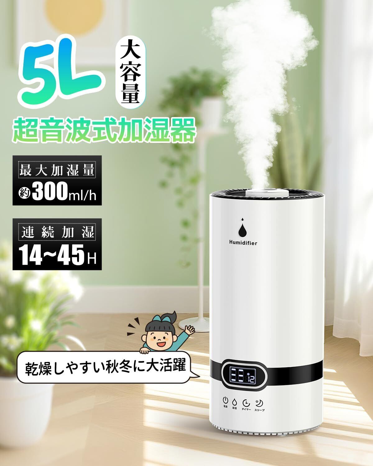 この加湿器は2025年の新モデルとして登場し、超音波式でパワフルな加湿を実現。5Lの大容量水タンクを搭載しており、300ml/hの加湿量で最大45時間の連続使用が可能です。上から給水できる設計で、手軽に水を補充でき、オフィスや寝室、リビング、さらには観葉植物にも最適な潤い環境を提供します!