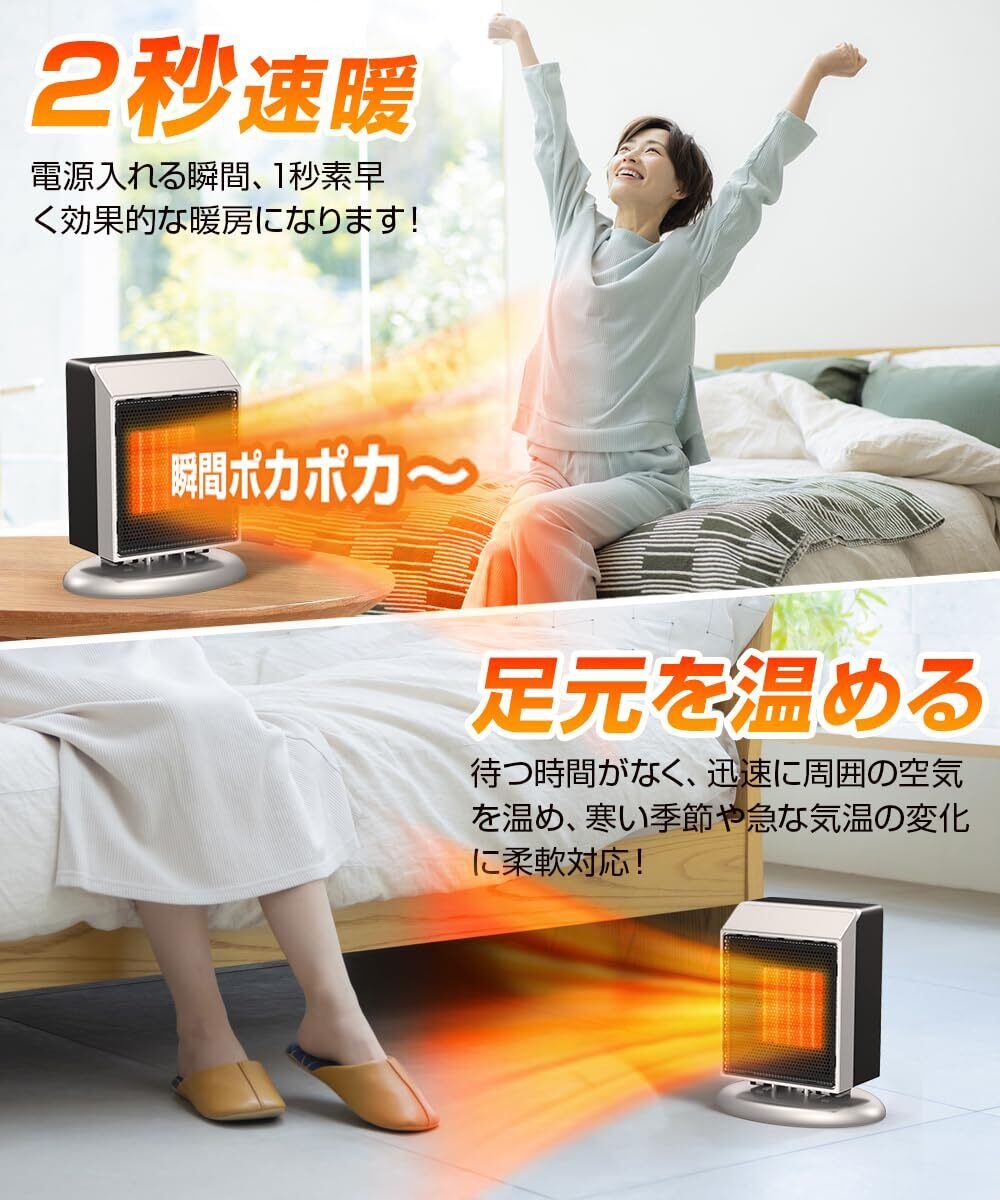 このセラミックヒーターは、驚くべき速暖機能を搭載しています。わずか2秒で温風を出すことができ、寒い冬の朝や急な冷え込みにも即応!デスク下や足元など、どんな空間でも快適な暖かさを瞬時に提供します。