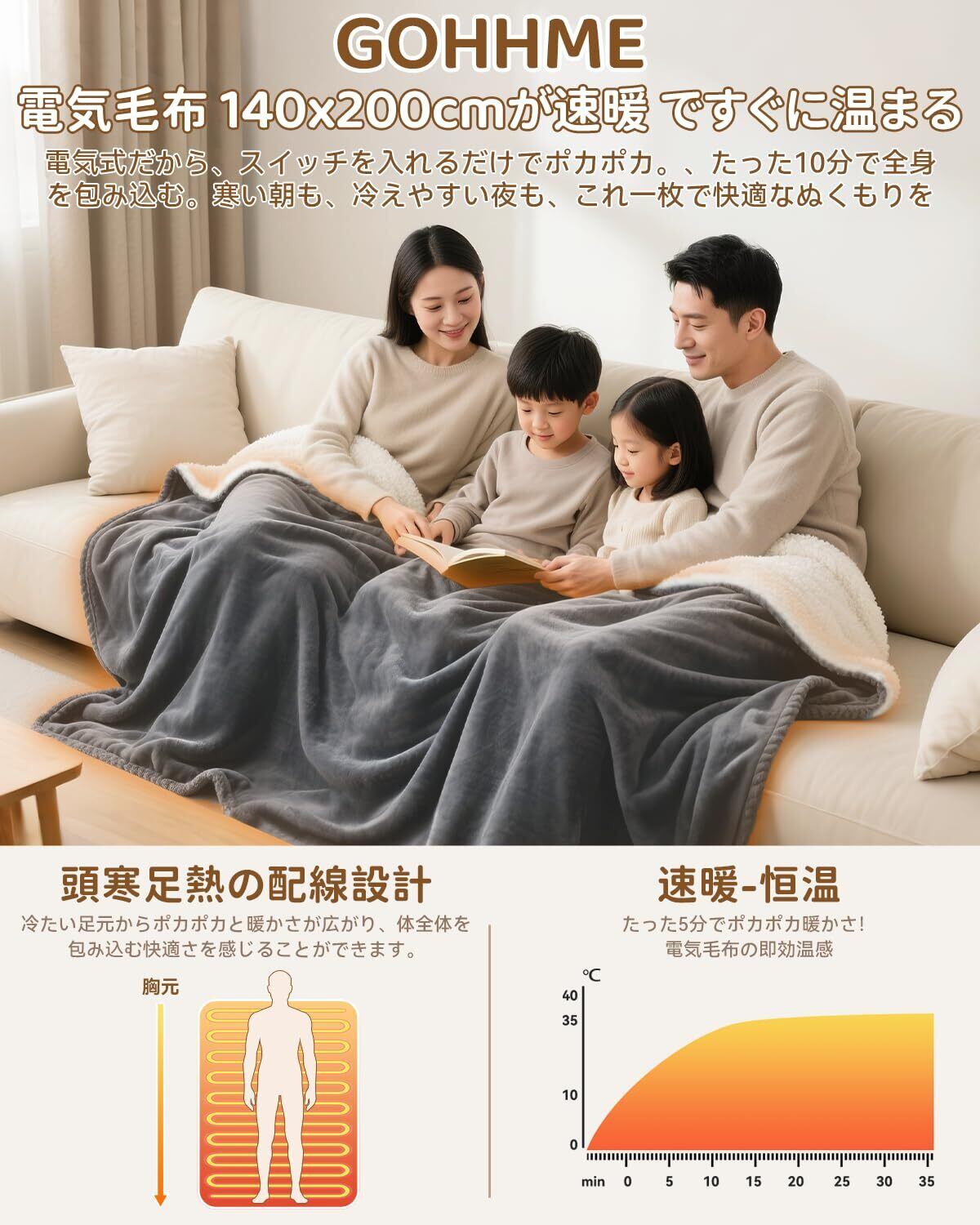 寒い冬にぴったりの『GOHHME 電気毛布』。200×140cmのダブルサイズは、掛け毛布としても敷き毛布としても使えるため、家族みんなで暖まりながら心地よい時間を過ごせます。ふわふわの肌触りとやさしいデザインが、あなたのインテリアにもぴったり合うことでしょう。