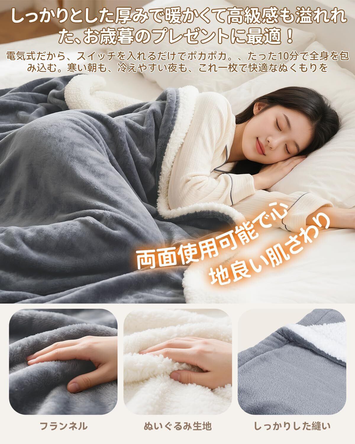 「敷毛布&掛け毛布&冬の暖かいギフト&さまざまなシーンで活躍」この冬用毛布 はただの毛布だけではありません。膝掛けや肩掛け、敷き毛布など、さまざまな使い方ができます。ベッドだけでなく、ソファでテレビを見るときやオフィスの椅子に座っているときにも活躍します。この冬の寒さから解放されましょう。おしゃれなパッケージも付属しているため、親友へのホリデー贈り物にも最適です!GOHHME 電気毛布は、冬の寒さから解放され、心地よい温かさを提供する素敵な選択肢です。快適な眠りをサポートし、暖かく包まれながらリラックスできる時間を提供します。この冬、GOHHME 電気毛布で暖かさを感じてみませんか?ぜひお試しください。