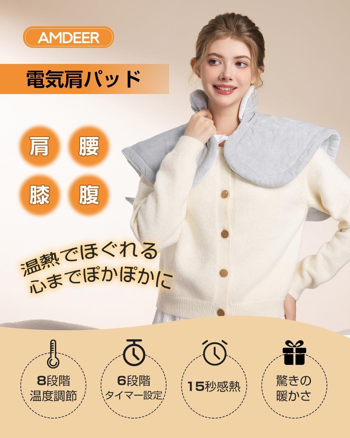 Amdeer 電気肩パッド 電気肩当て 8段階温度切替 6段階切タイマー ふわふわ 高級フランネル生地 加熱 肩当て 自宅 オフィス用 スポーツ観戦 省エネ 暖房器具 洗える 電気パッド 防臭 ダニ退治 防寒対策 52*58cm ライトグレー