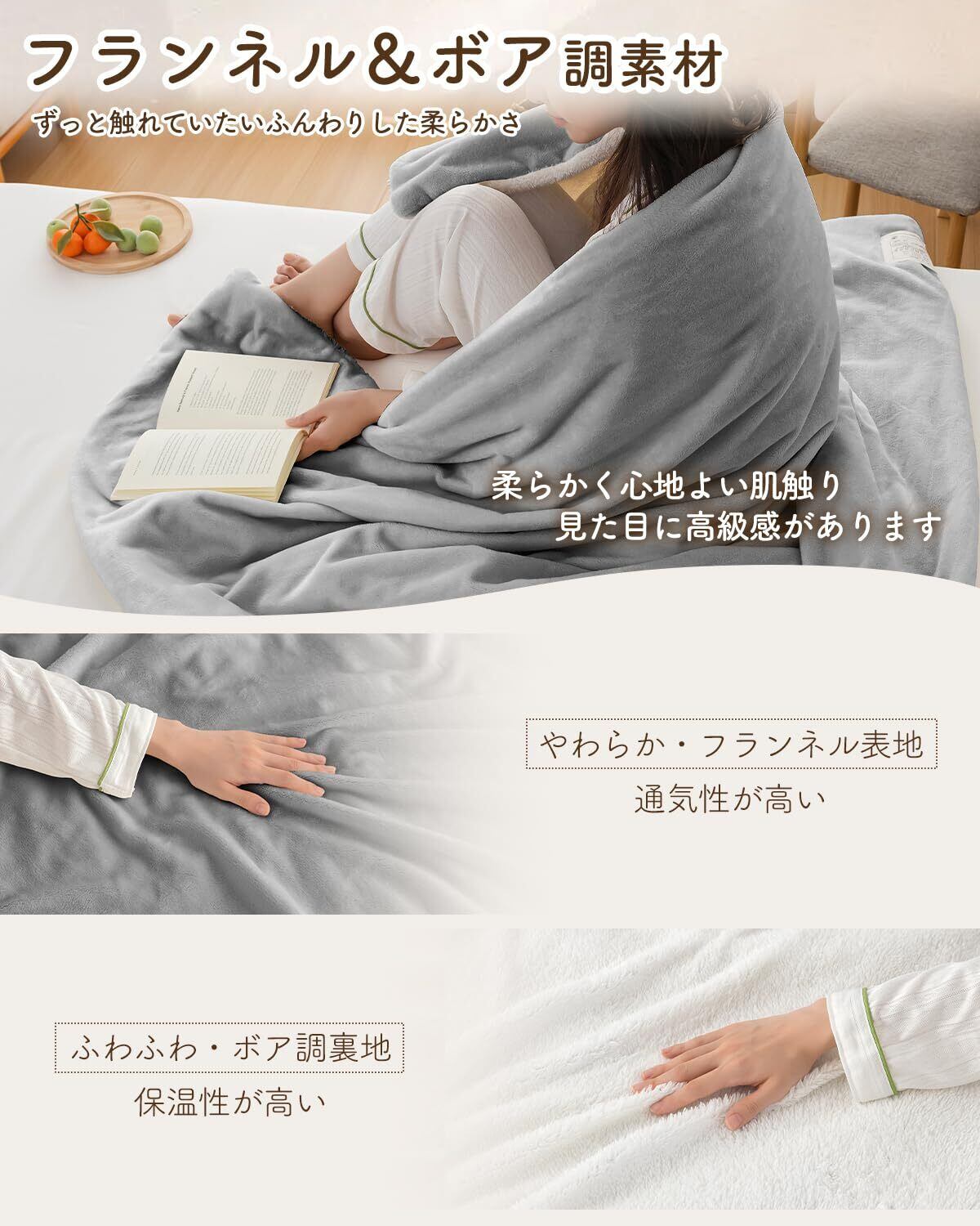電気毛布 掛け敷き兼用 電気ブランケット 180×130cm【両面用可能フランネル&ボア調素材・10段階温度調節】電気ひざ掛け 速暖 電気敷き毛布 ふわふわ 柔らか 肩掛け 膝掛け 省エネ 洗える ダニ退治 頭寒足熱 防寒対策 暖房器具 PSE認証済み グレー