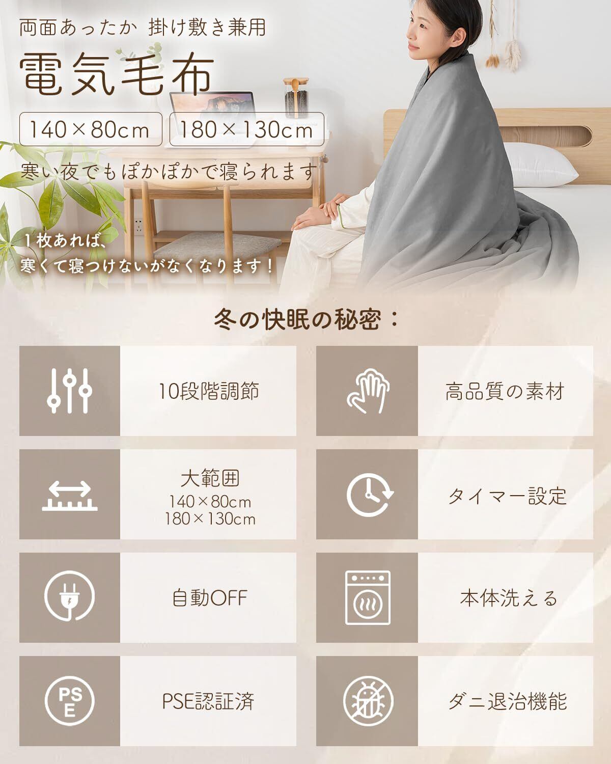 【電気掛け敷き毛布・商品仕様】「サイズ」140x80cm 180x130cm「電圧」100V/50~60HZ「消費電力」定格75W。「梱包内容」電気掛け敷き毛布本体x1、コントローラーケーブルx1、日本語取扱説明書x1【PSE認証取得】自主検査のPSEだけではなく、国際基準ISO17025やLVD EMCの認証を取得しています。安全安心な品質が確保できます。