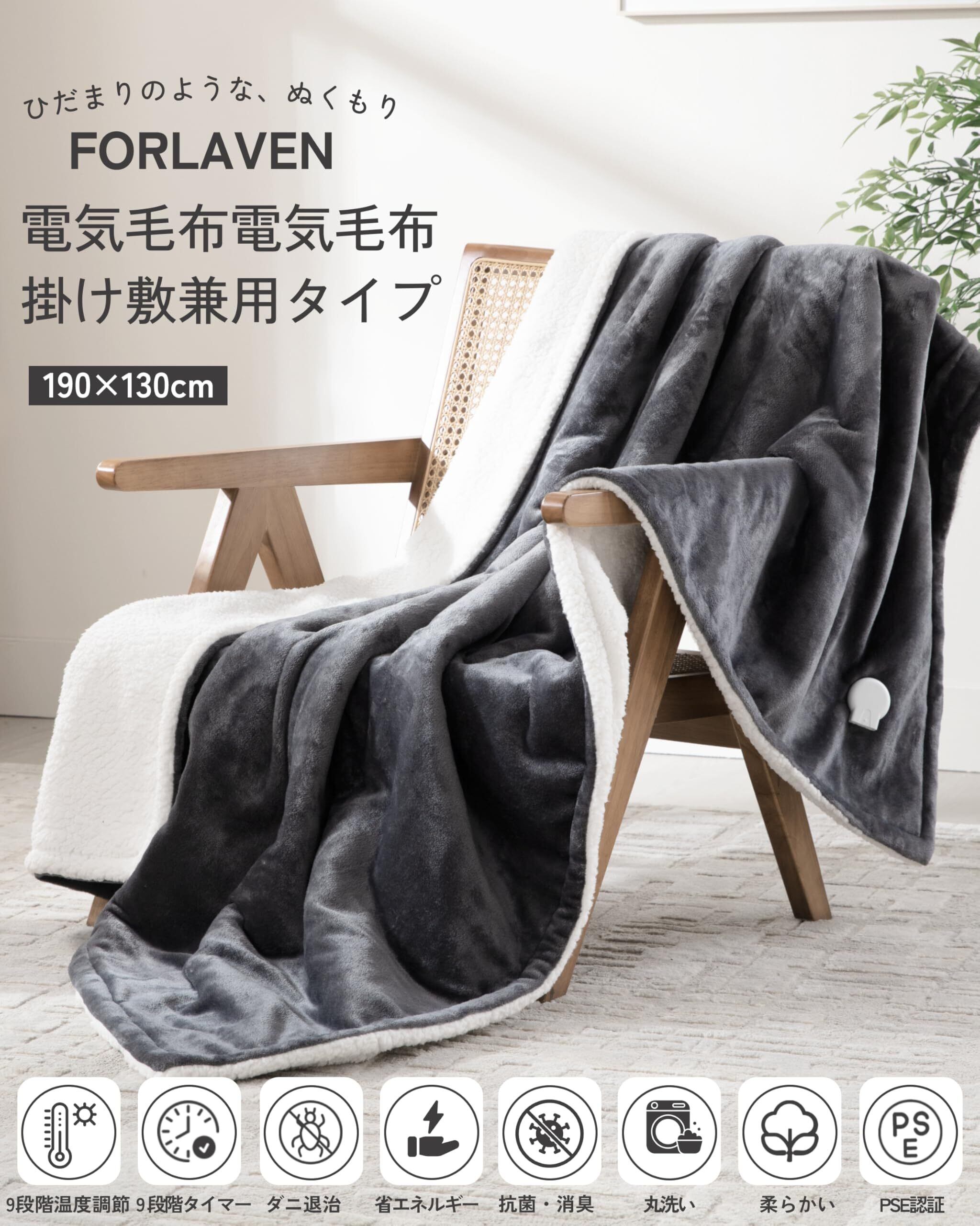 【在庫処分】電気毛布 掛け敷兼用 洗える【大判 190×130cm】洗濯ネット付き 速暖 9段階温度調節 タイマー付き 節電 省エネ ダニ退治 防寒対策 丸洗いOK フランネル&シープボア 軽量 肩掛け 膝掛け シングル PSE認証済み (ダークグレー) Forlaven