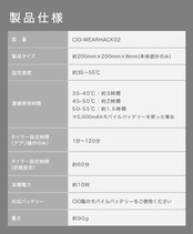 【普段着を電熱ウェアに変形!】WEARHACK2はBluetoothを搭載し、アプリ操作が可能なヒーターデバイスです。モバイルバッテリー【別売】※を製品内ポケットにセットして、サッと取り付けるだけで、お気に入りの普段着がいつでもON/OFFできる防寒電熱ウェアに変わります!暖かいけれどアウターを選べない従来の電熱ベスト、ヒートジャケットとは異なり、おしゃれもお楽しみいただける新発想のウェアラブル製品です。 ※CIOから販売しているSMARTCOBY SLIMと同等サイズで、5V/2A以上のモバイルバッテリーをご使用いただくようお願いします。それ以下の出力のものをご使用いただくと、電源が入らなかったり、途切れたりする可能性がございます。お持ちでない方は別途お買い求めいただく事で快適にご使用いただけます。