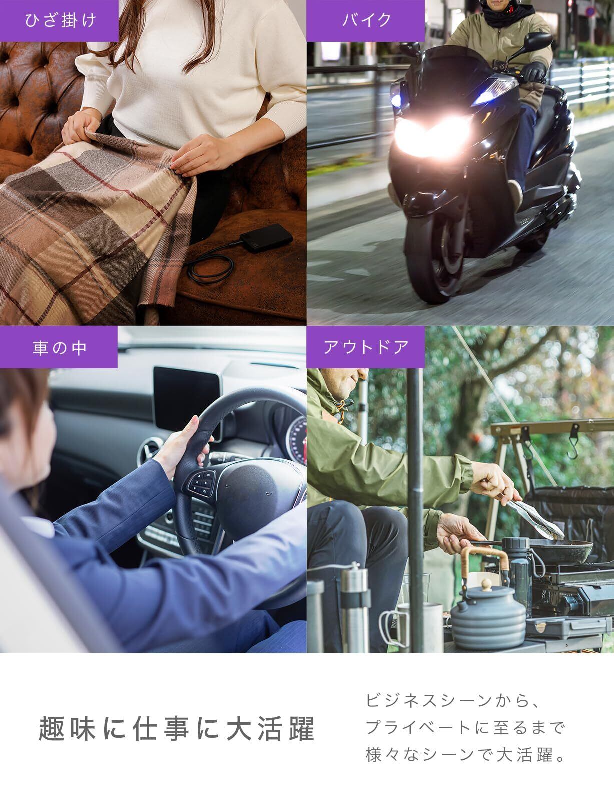 【直感的で簡単な操作】電源に繋いだら、電源ボタンを押すだけのON/OFF操作だから簡単に使えます。薄型モバイルバッテリーを使う場合は備え付けのポケットに収納可能だからとてもコンパクト!