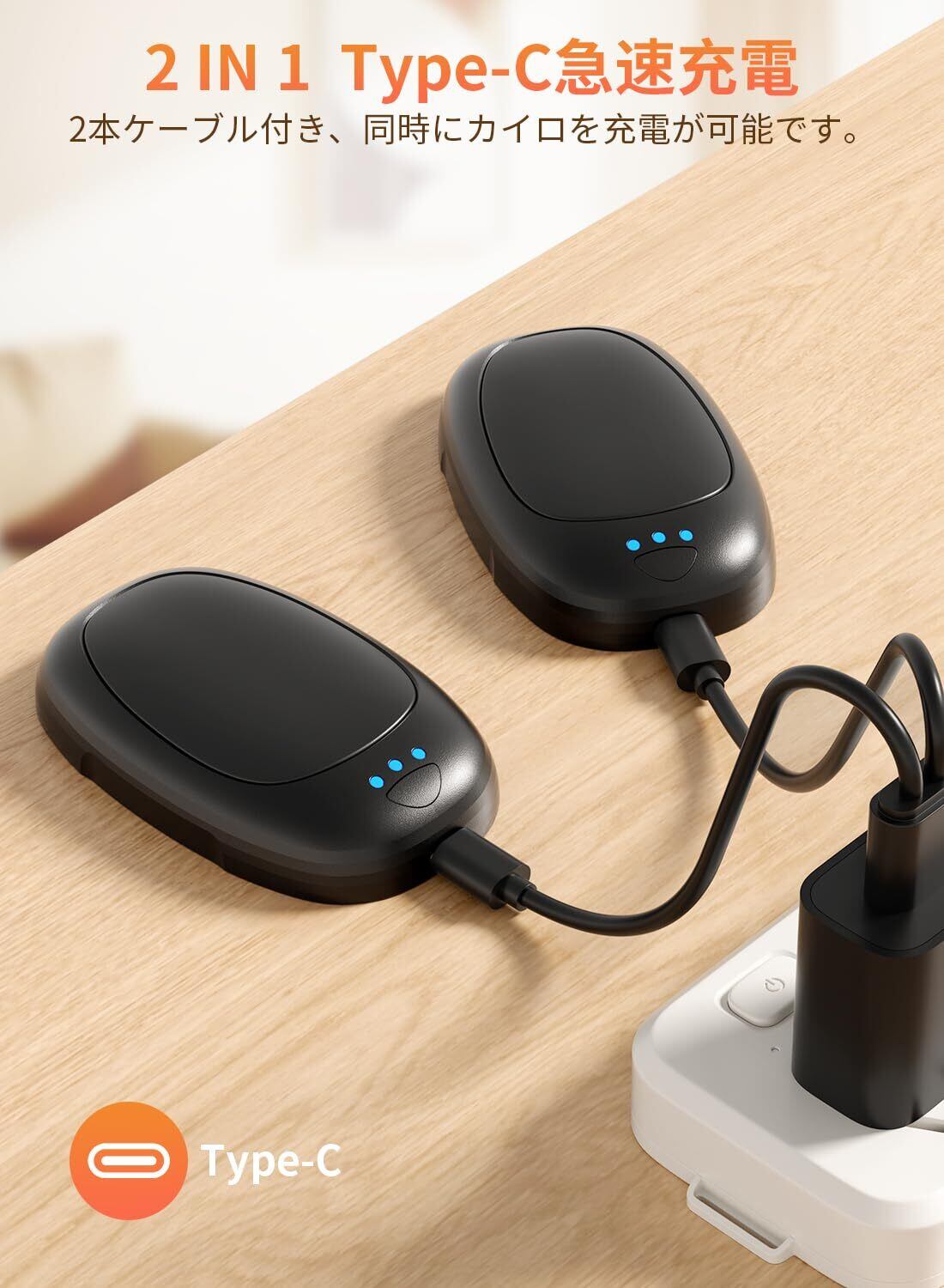 「2本充電ケーブル」また、電気かいろは2本USB-C充電ケーブル付き、カイロを同時に充電するもでき、充電時間を1本しかない他社と比べて半分短縮、わずか4-5時間で二つとも満電状態になる。