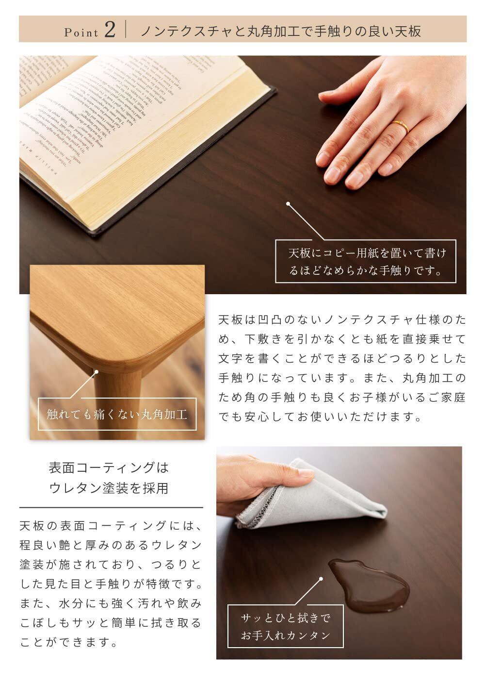 このこたつテーブルは、ハイタイプとロータイプの両方として使用でき、シーンに応じて使い分けが可能です。寒い季節にはこたつとして、普段はおしゃれなダイニングテーブルやデスクとして活躍します。多用途に対応できるデザインです。