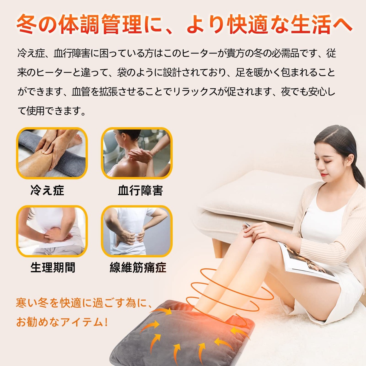 【お肌に優しい生地・優れた保温性・洗濯可能】この電気足温器は暖かくて、超柔らかな肌触りが魅力の「マイクロプラッシュ(Microplush)」を採用します。「マイクロプラッシュ(Microplush)」は、柔らかいビロードのような繊維が特徴です、 繊維の中に空気を含んで熱を逃さないので、フリースよりも保温性に優れています。手洗いだけでなく、洗濯機で丸洗いできます。洗える前に、ヒーターのプラグ部分を抜いて、カバー部分の洗濯可能です。(コントローラーをや電源コードの洗浄はできません。)