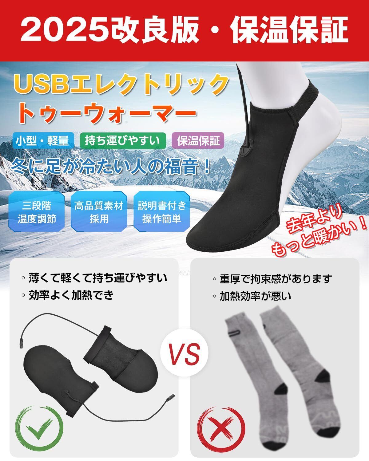 【2025改良版USBエレクトリックトゥーウォーマー&男女兼用】この革新的な足元ヒーターは前世代モデルから全面的に進化を遂げ、加熱面積が30%アップし、重量も85gまで軽量化しました!ポケットに入れてどこへでも気軽にお持ちいただけます。シリコン素材の高弾性バンドと人体工学に基づいた3D立体裁断により、22~28cmのあらゆる足型にフィット。