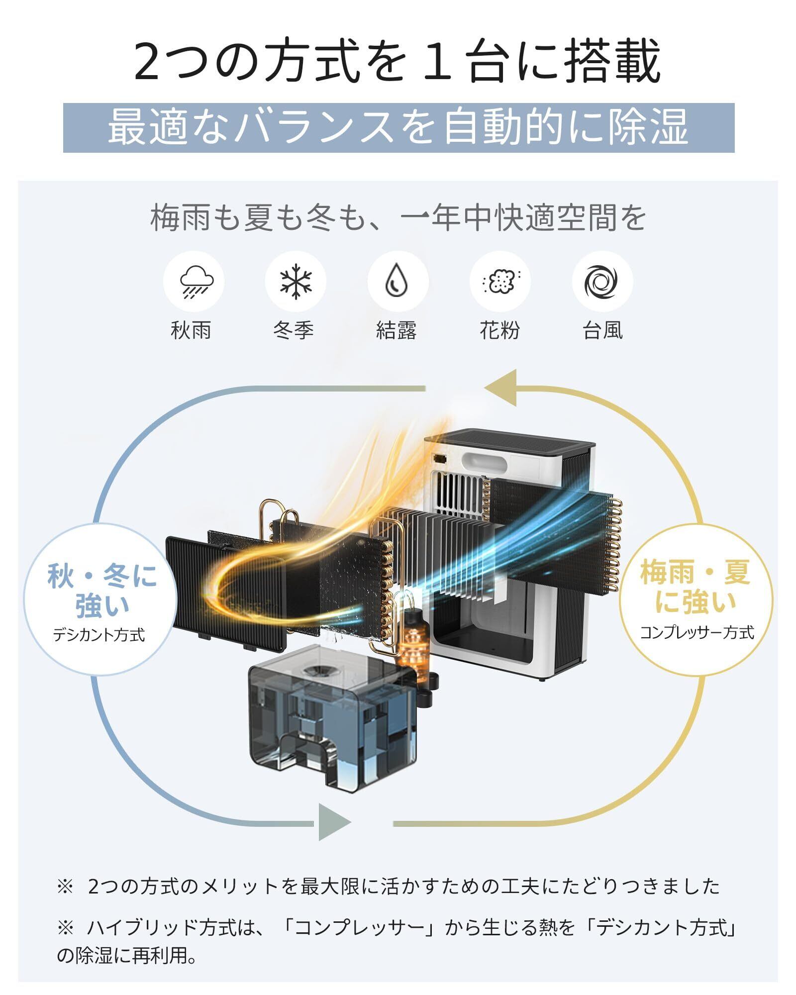 【進化版ハリブリッド式除湿機】のハイブリッド除湿機は、ペルチェ除湿とコンプレッサー除湿の両方の技術を組み合わせた次世代型の除湿システムです。その仕組みは、まず湿った空気が半導体冷却ユニットを通って予備冷却され、一部の湿気が除去されることでコンプレッサーへの負担を軽減します。その後、空気はコンプレッサーによってさらに冷却され、効率的に大量の水分を凝縮・排出します。ハイブリッド除湿機の最大のメリットは、その優れた環境適応能力にあります。従来のペルチェ式では苦手だった低温環境でも安定した除湿性能を発揮するため、冬場の結露対策から梅雨時のジメジメまで年間を通じて効果的です。この除湿器は静音性にも配慮されており、夜間などは半導体メインの運転モードを選択することで、騒音を30dB以下に抑えることが可能です。