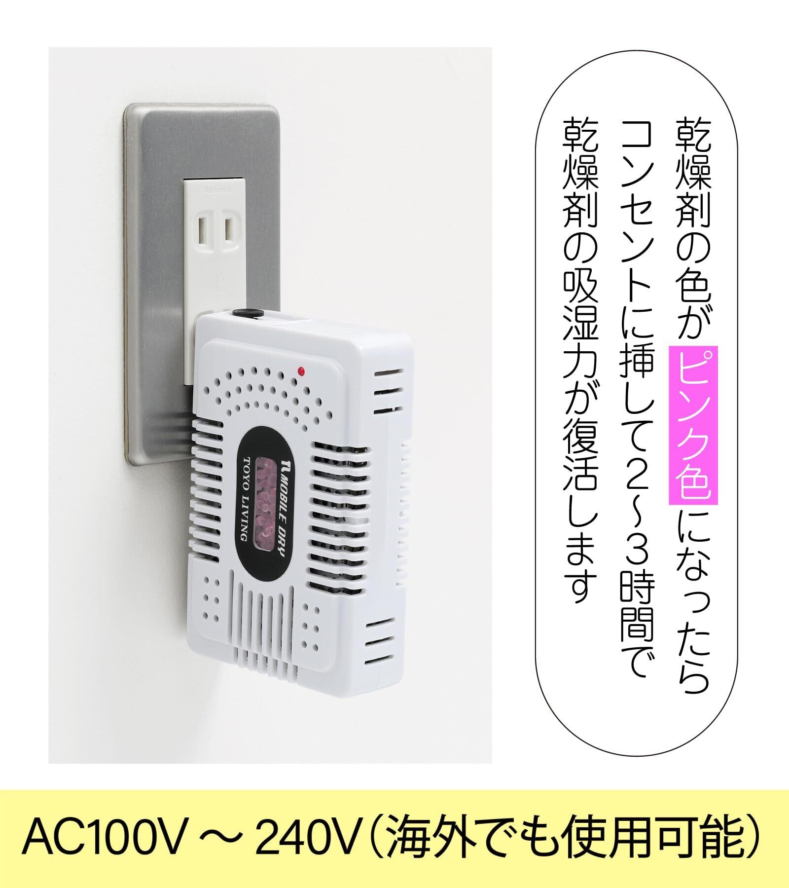 乾燥剤に代わる加熱再生式の除湿ユニット。 内部の乾燥剤はコンセントに差せばリフレッシュ! 繰り返しお使いいただけます。 乾燥剤は安心の日本製。電圧はAC100~240Vまで対応ですので、海外旅行でもご使用いただけます。