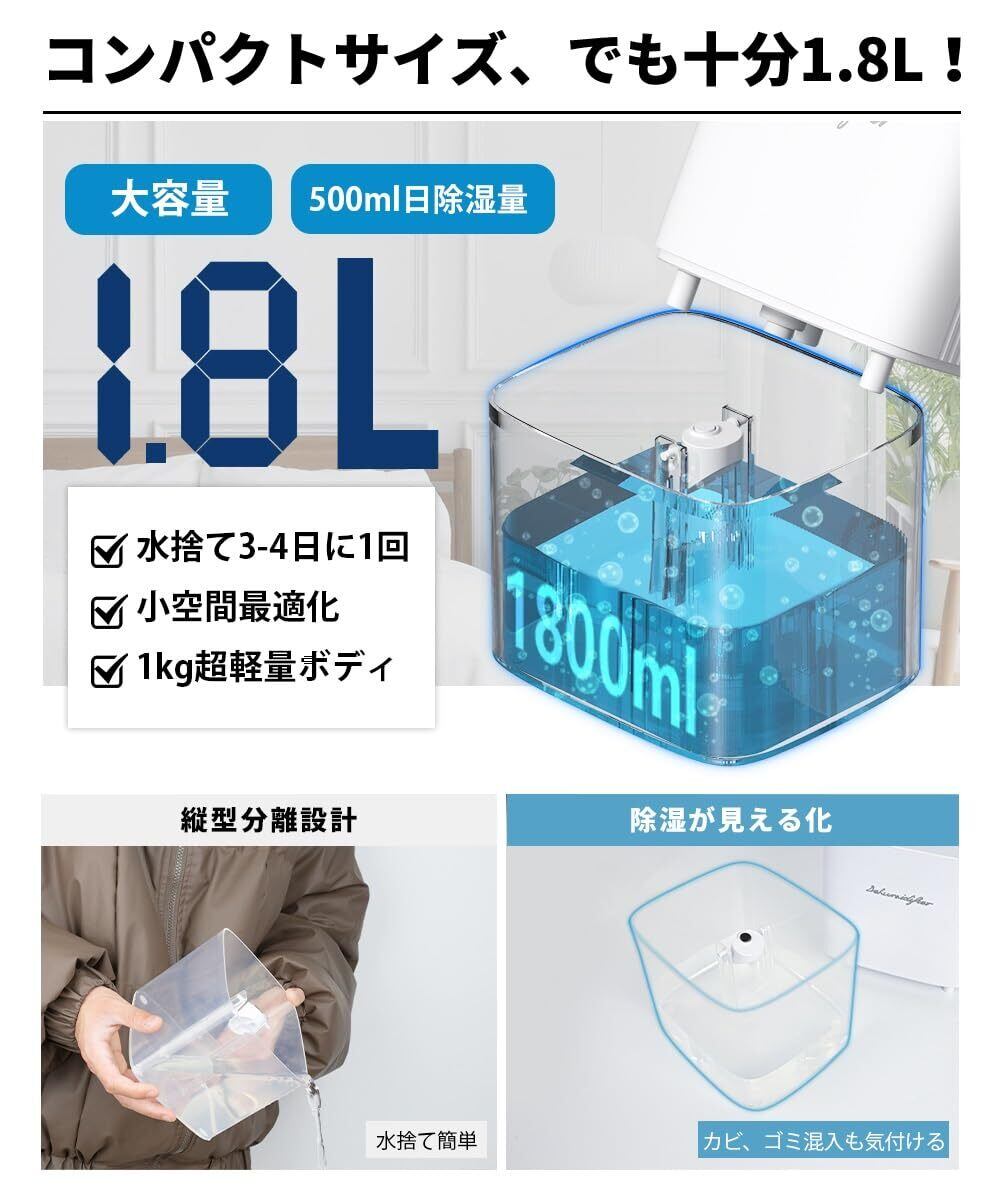 【大容量1800mlの強力除湿】最新のペルチェ式技術を採用しており、1日あたり最大500mlの湿気を吸収することができます。さらに、1800mlの大容量タンクを搭載しているため、頻繁に水を捨てる必要がなく、連続稼働が可能です。<除湿効率についてのご注意> 最大除湿量は、温度30℃、湿度98%という理想的な条件下で長時間の測定値です。使用する環境の温度や湿度によって、実際の除湿量は異なる場合があります。当製品の除湿効果は、穏やかで持続性のある性質を持ち、即効性よりも空間の湿度を徐々に安定して下げ、長時間快適な状態を保つことを特徴としています。除湿方式の特性上、コンプレッサー式と比較すると除湿効率が若干低くなる傾向があります。その結果、設定湿度に達するまでに時間がかかる場合があることをご了承ください。