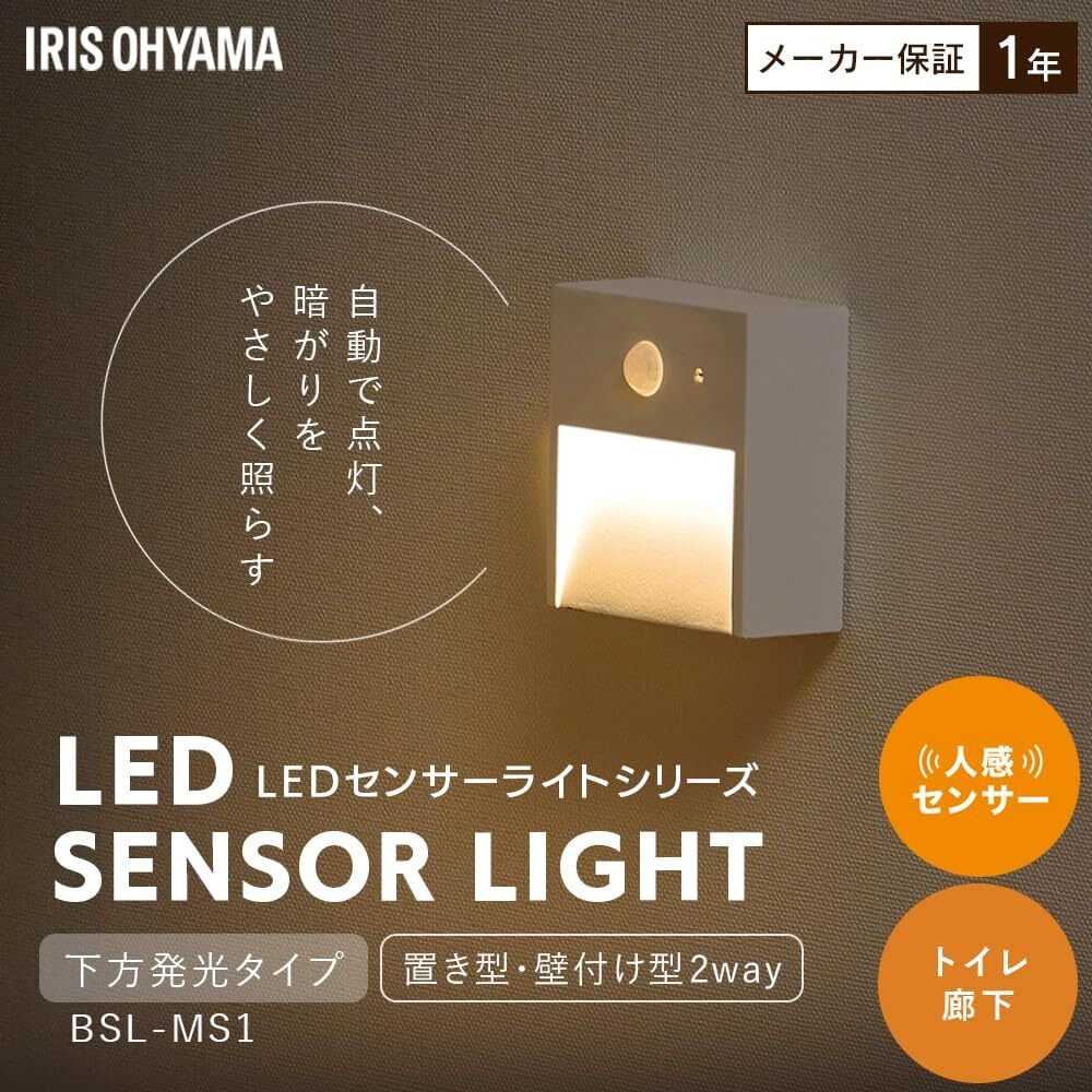 \【在庫処分】アイリスオーヤマ 乾電池式LEDセンサーライト 下方発光タイプ 壁つけ式 置き式 自動点灯 常時点灯 BSL-MS1/