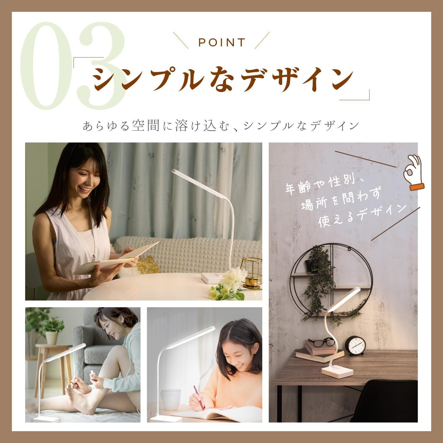 【無段階調光&3色切替でシーンに合わせた明かりを】 明るさを自由に調整できる「無段階調光」機能を搭載。ボタンを長押しすることで、低輝度から高輝度までお好みに合わせた明るさに設定可能です。さらに、白色光・暖色光・自然光の3つの色温モードをワンタッチで切替でき、読書・仕事・就寝前など、シーンに合わせて使い分けできます! 【タッチ式スイッチで静かに操作】 タッチセンサー式のスイッチを採用し、音を立てずに電源のオンオフや調光が可能。長押しで明るさ調整、短押しで色温切替と直感的に操作できます。集中したい深夜の作業や勉強中にも音を気にせず使えます。 【目に優しい光設計&ブルーライト軽減】 高品質LEDチップを30個搭載し、ちらつきのない安定した光を実現。光が均一に広がる設計で、目にやさしく、長時間の読書やデスクワークでも負担を軽減します。また、ブルーライトを抑えた設計で、お子さまの学習用にもおすすめです✨ 【USB充電式&コードレスで使いやすい✊】 付属のUSBケーブルで充電でき、コードレスでも使用可能。コンセントの位置を気にせず、寝室やリビング、持ち運びにも便利です。リチウム電池は交換にも対応しており、長くご使用いただけます。 【自由に曲がるフレキシブルアーム】 やわらかく自由に動かせるアームを採用しており、照らしたい位置にしっかり光を当てられます。スリムでシンプルなデザインは、様々なインテリアに馴染み、省スペースで設置できるのも魅力です✨
