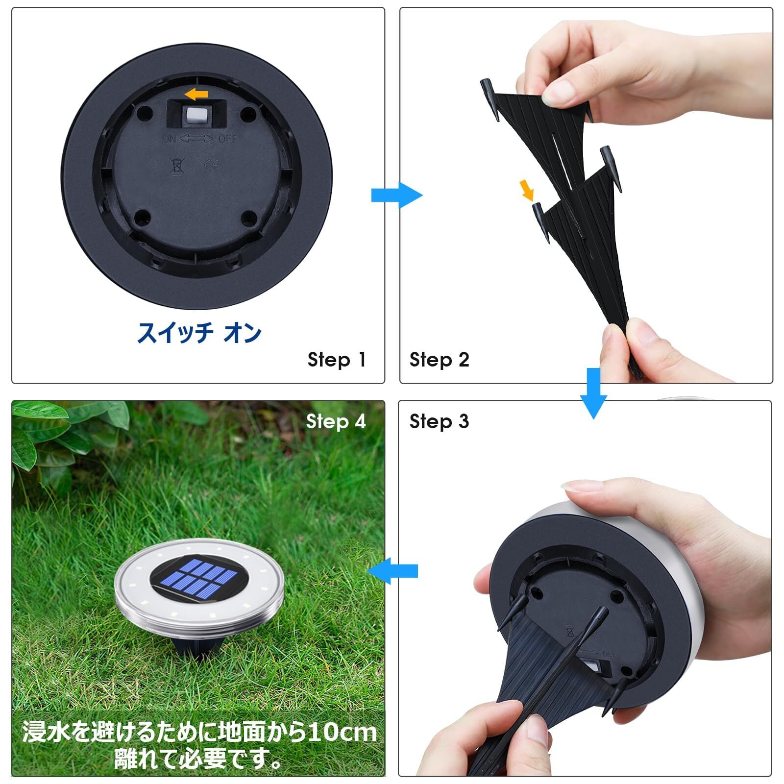 工具不要、一つのソーラーパスライトに2個のスパイクが付属しています。屋外ソーラーライトの直径、高さ(スパイクを含む)、厚みは8.6cm、10.1cm、2cmであります。スイッチをONにして地面にさして設置するだけですぐに使え、女性とお年寄りも気軽に使えます。ソーラーガーデンライトはFCC、CEなどの認証取得ため、ご安心にご購入ください。それに保護機能付きから、過充電保護及び過熱保護でき、お客様の安全を守ります。お買い上げから一年間品質付き、何かご質問があれば、いつでもご気軽にとご連絡ください。返品及び交換などのサービスを提供させていただきます。
