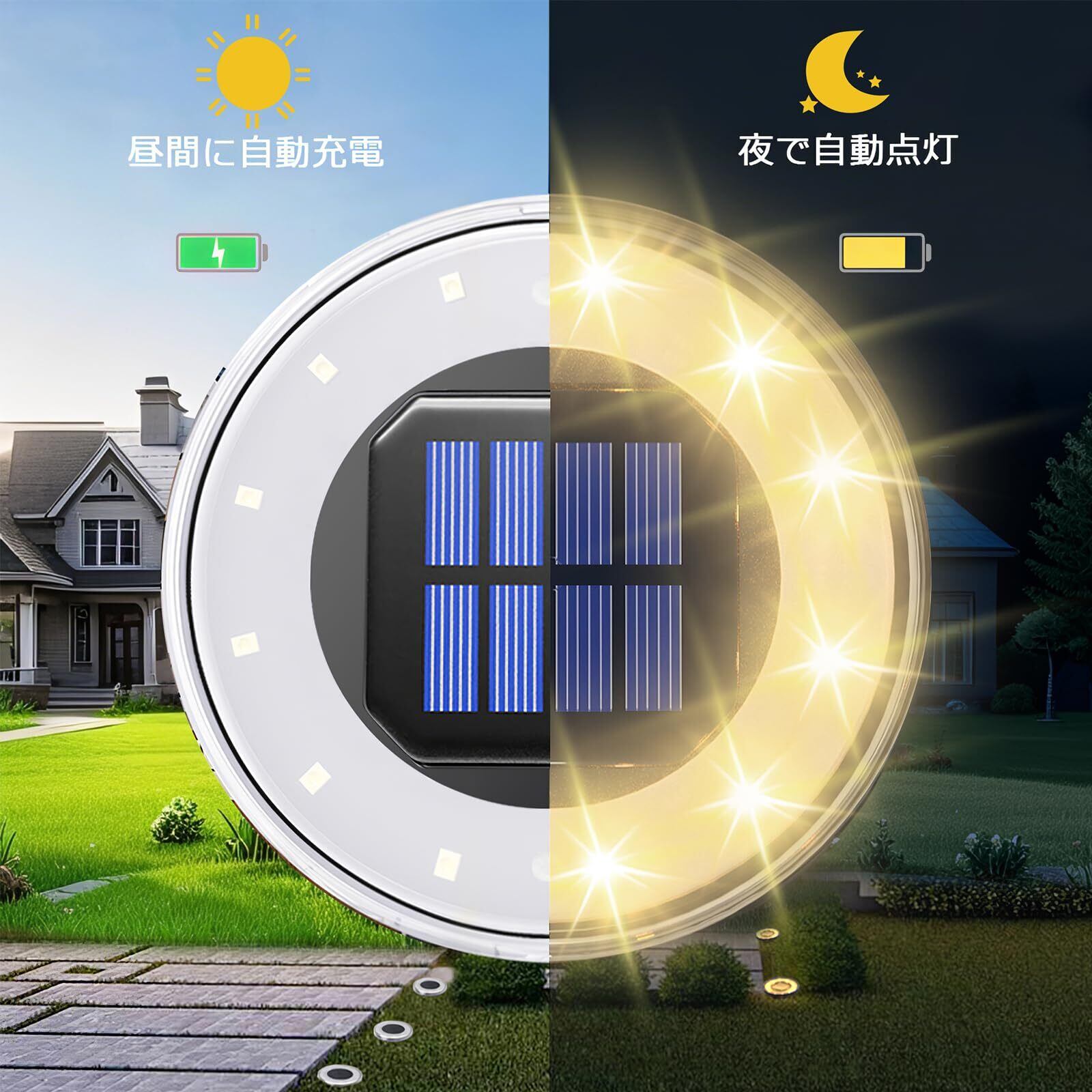 LED ソーラーライト材質はPP+PSで、HDレンズの材質は光透過率が優れています。8個高品質LEDが揃え、発光効率の高い上に、360°全方向を照らせ、光射範囲は広いです。強度が強くて傷つき難い素材で車が踏んでも問題ありません、耐荷重は180kgで安定してご使用いただけます!電球色のやわらかい光が庭を華やかにして、庭の雰囲気がぐっとおしゃれになり、庭がワンランクアップ!