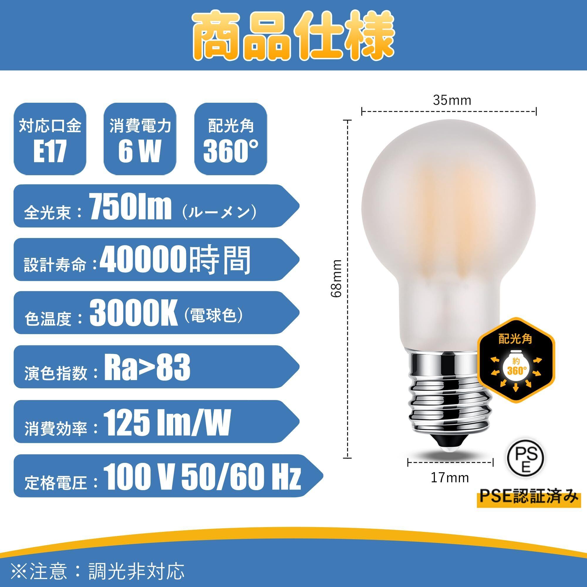 製品仕様:対応口金:E17、定格消費電力:6W(60W形相当)、定格電圧:100V 50/60Hz共用 、色温度:3000K 電球色、全光束:750lm、本体サイズ:Φ35*68mm。※注意:調光器非対応