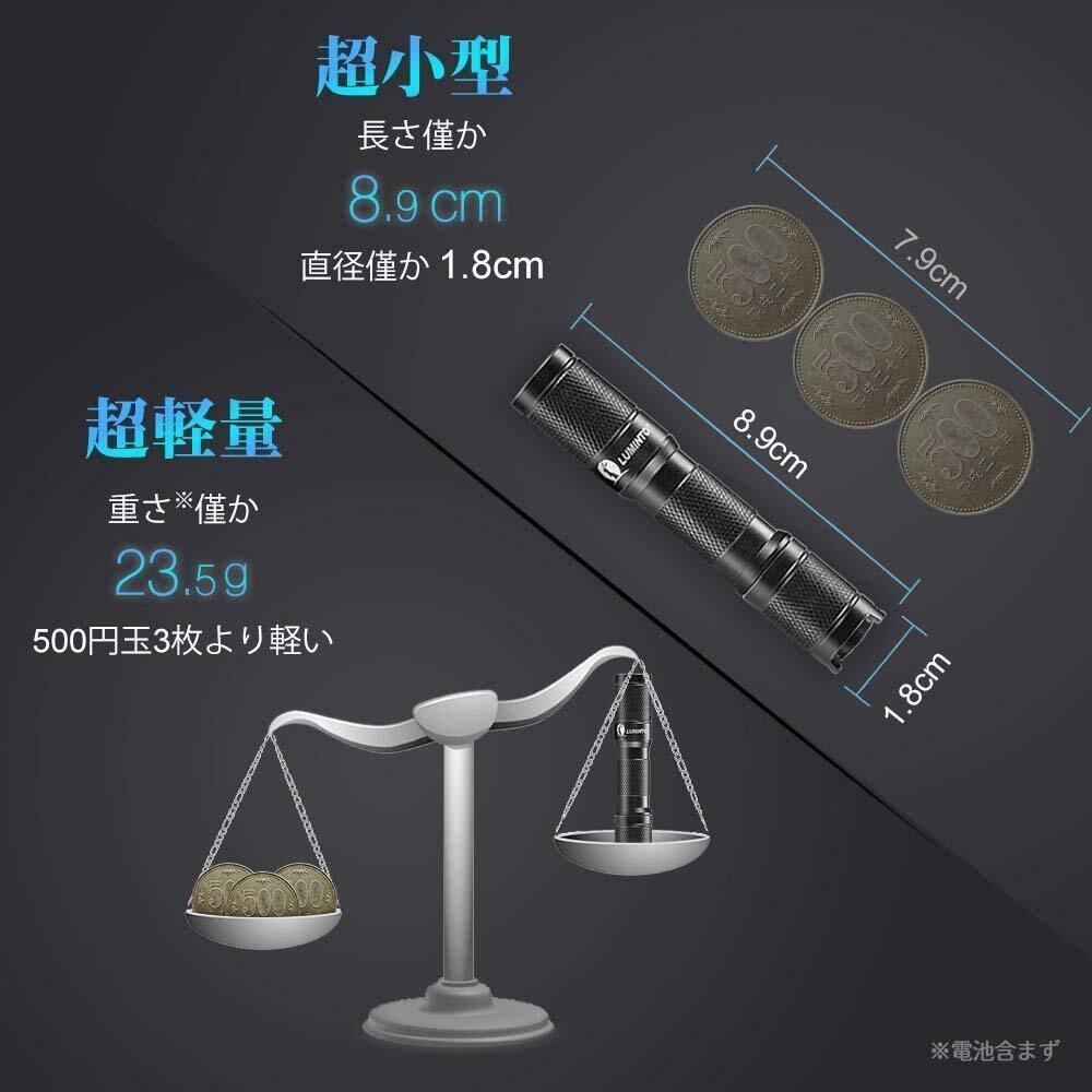 【超小型超軽量・五段階調光】航空機用アルミニウム合金を用いられた本体は、手のひらに収まれる8.9cm*1.85cmというコンパクトサイズになります。僅か23グラムの重量(電池含まず)では、500円玉3枚よりも軽く、片手で簡単に操作でき、携帯時にご負担になりません。5段階のライトモード(ターボ /高/中/ 低/ストロボ )機能を搭載しています。点灯モードはモードメモリ機能を搭載、常に使用する明るさから点灯できます。夜釣り・山登り・夜道の一人歩き・防犯・護身用・緊急災害時など様々なシーンに心強い味方です。