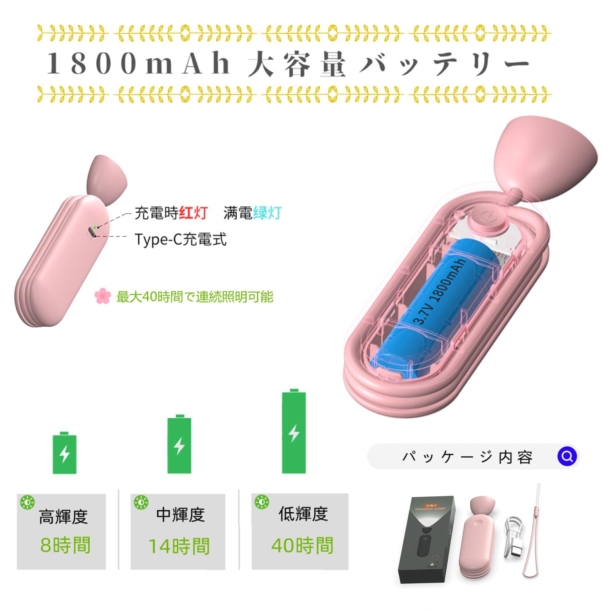 1800mAh大容量バッテリー --- 軽量ボディに1800mAhの大容量バッテリーを内蔵し、4時間のフル充電で高輝度時約8時間、低輝度時約40時間点灯します。 TYPE C充電ポートは通常のUSBより便利な充電式携帯ライトです。 (ご注意:電源アダプターは付属しておりませんので、ご自身でご購入ください)
