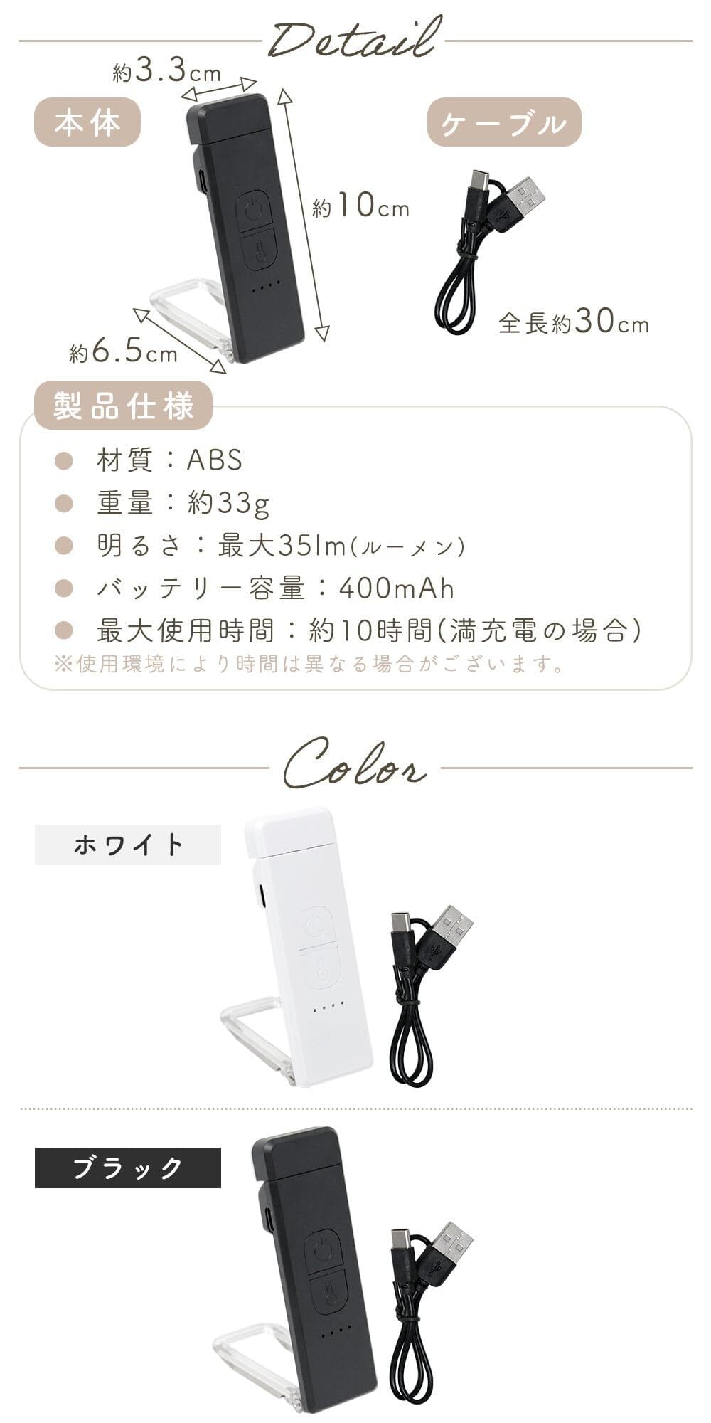 【USB充電式&長時間使用】USB充電式で、約1時間の充電で最大10時間の連続使用が可能。コンセントやモバイルバッテリー、パソコンからも充電できるので、いつでもどこでも使用可能。省エネ設計で電池不要のエコ仕様。停電時や防災グッズとしても活用できる安心のバッテリー性能。