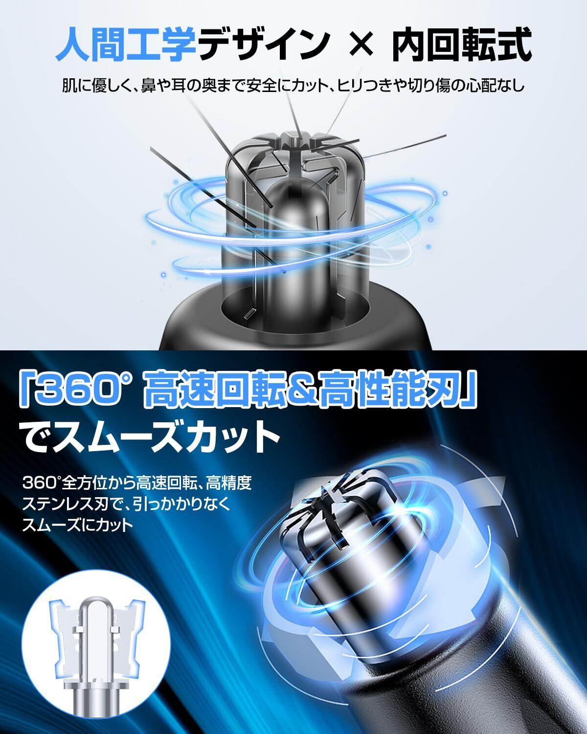 【一台多役・高速360°回転】 この 鼻毛カッター は、鼻毛だけでなく、耳毛、眉毛、ひげのトリミングにも対応する多機能設計です。12000RPMのエチケットカッター 高速モーター駆動を搭載しております。360°全方向回転する高精度の刃が搭載されており、どの角度からでも効率よく毛をカットできます。高速回転でスムーズに動作し、わずかな時間で清潔な仕上がりを実現します。特にデリケートな部分の処理においても、引っかかりや痛みを感じさせない滑らかな操作感が特徴です。これ一台で多様なニーズに応えるため、日常のケアがより簡単に行えます。