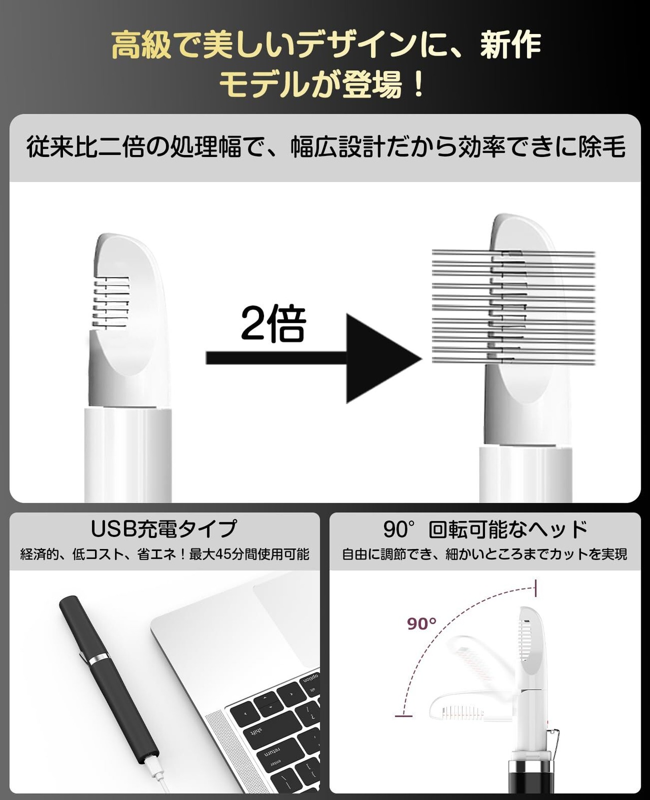 【2024年最新改良版ヒートカッター】ダブルデッキコームは従来比二倍の処理幅で、幅広熱線を使用することで約2倍のスピードで除毛をすることができるようになりました。発熱線の温度は200℃-300℃に達し、スピーディーに10-15本のヘアが一気にカットできます。USB充電式のものは、乾電池式と比べて電池交換の手間が省け、いつでもどこでも充電できます。