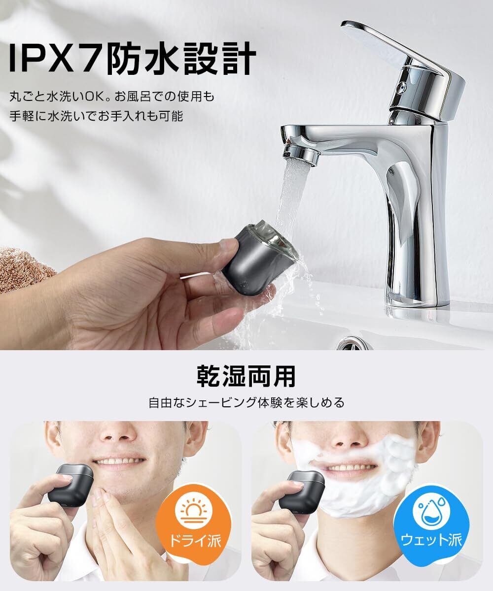 【IPX7完全防水&乾湿両用】 お風呂剃り もできる 電動髭剃り 。IPX7等級の防水設計により、本体を丸ごと水洗い可能。清潔に保ちやすく、お風呂場でも安心して使用できる 電動シェーバー 。ドライ剃り派の方にも、フォームや泡を使ったウェット派の方にも対応する2WAY仕様。これ1台で乾湿両用のシェービング体験を楽しめます。 ひげそりおすすめ として、 髭剃り カテゴリでも高評価を集める逸品。